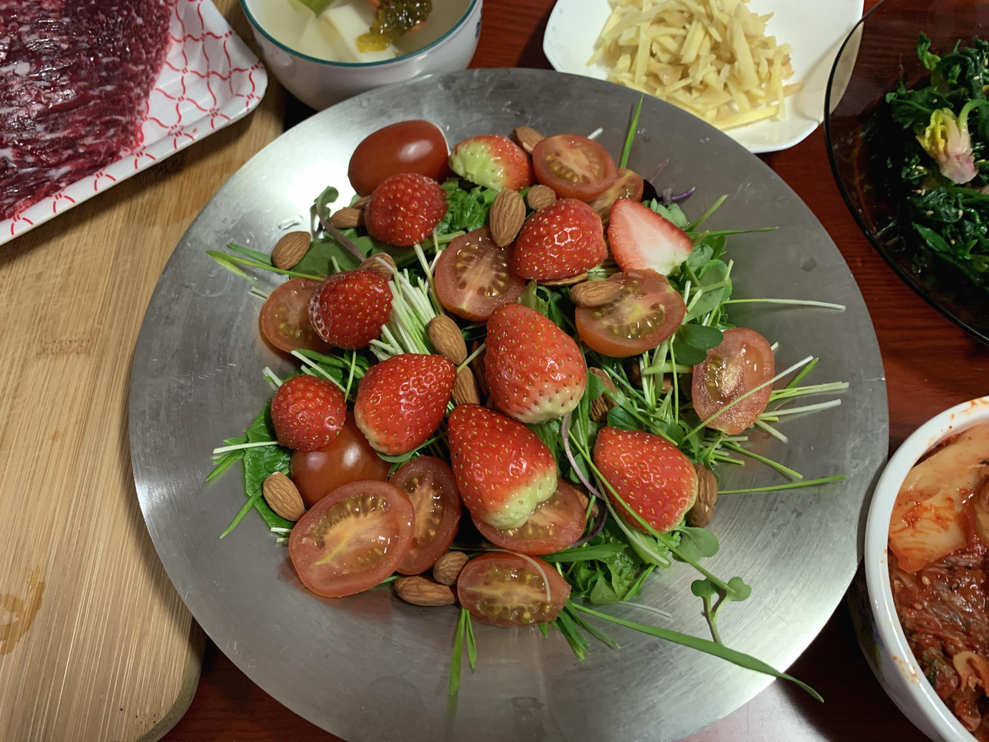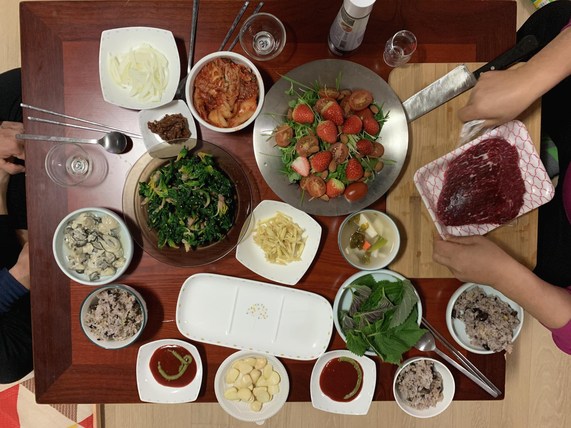 내가 좋아하는 육사시미와 딸기, 굴, 삼겹살, 소고기를 상위에 올려주신다. 이날은 먼저 육사시미가 메인 메뉴였다. 단골 정육점에서 미리 예약을 한 후 떼어 오는 육사시미다. 덩어리째 가져오면 입맛에 맞게 두껍게 썰 수 있다. 식감도 좋다. 생굴도 오랜만에 먹으니 맛있었다. 벌써 몇달전 일이다.
