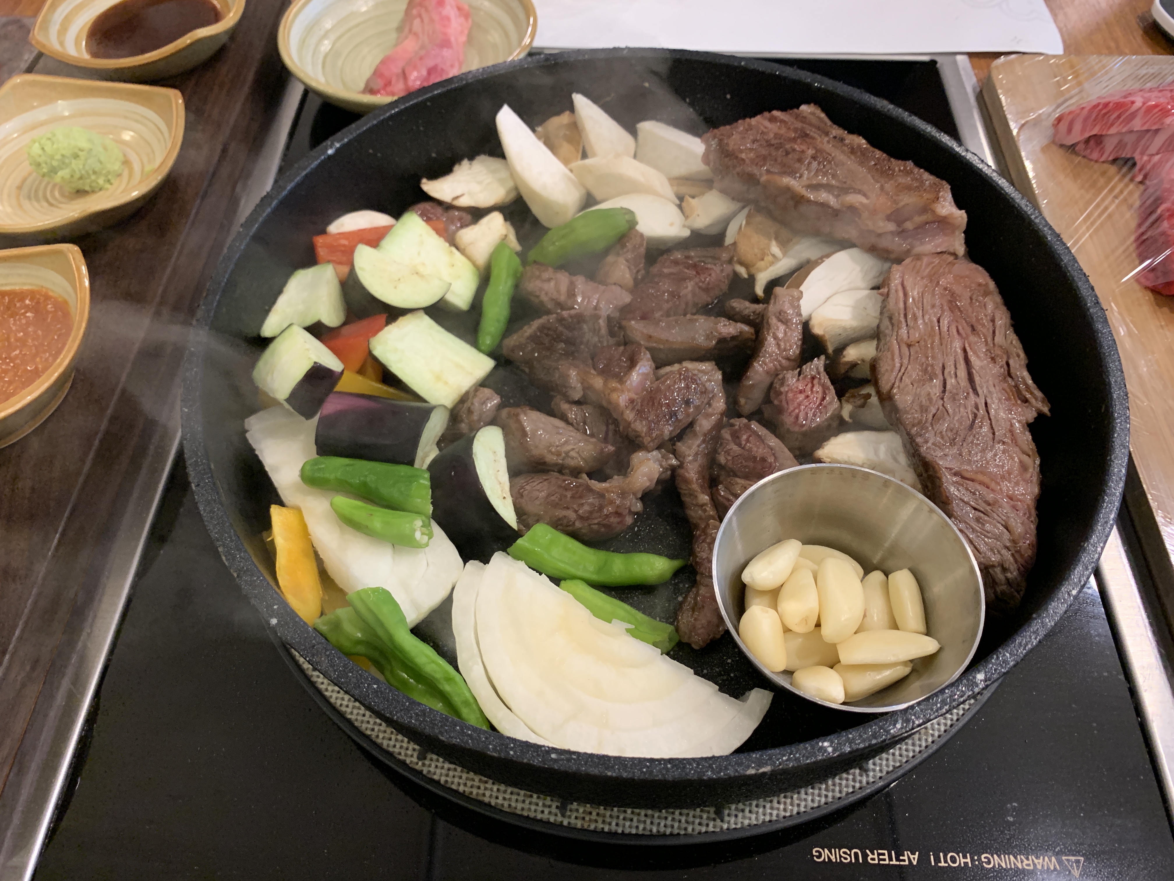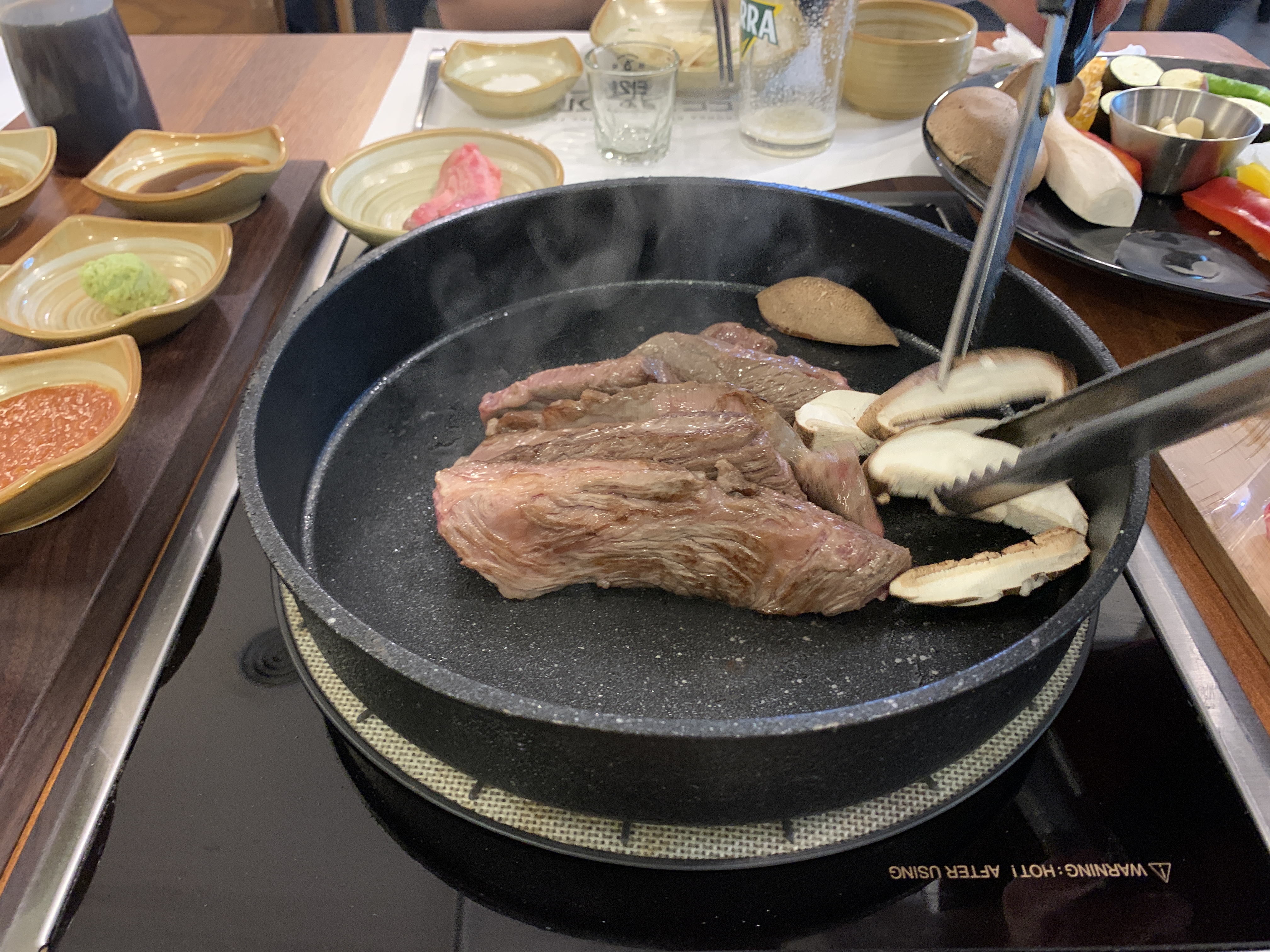 소고기가 익는다. 버섯과 마늘을 올려놓는다. 얼른 익어라.