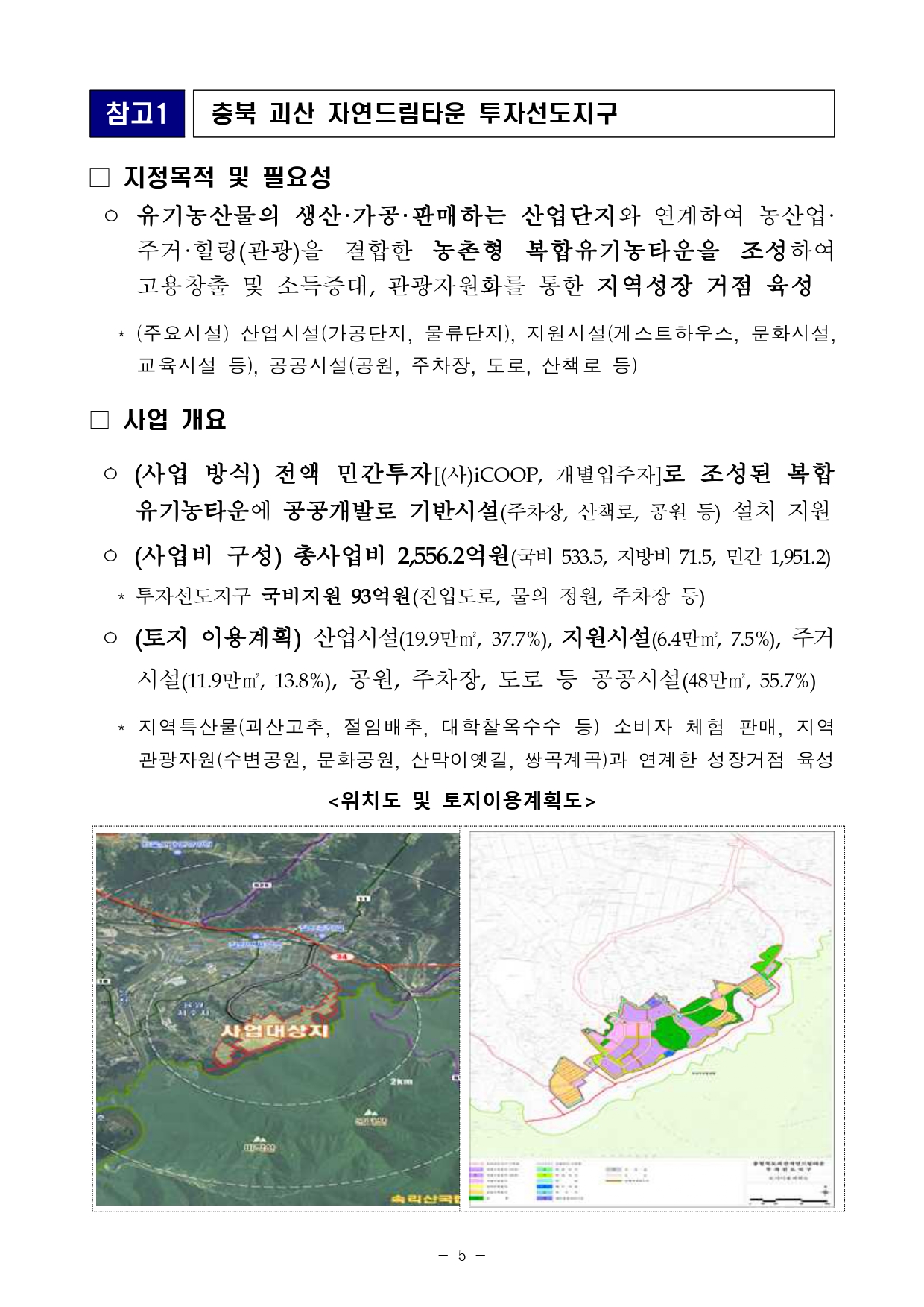 괴산 자연드림타운 투자선도지구는 지역 유기농식품을 생산, 가공, 판매하는 유기농산업단지와 주거․관광을 결합한 복합 유기농타운을 조성하는 사업이다. 괴산군과 아이쿱생산자협동조합*이 862,387㎡부지에 2,556억원을 투자하여 주변 관광자원과 연계하여 지역 문화·산업의 성장거점으로 육성할 계획이다.