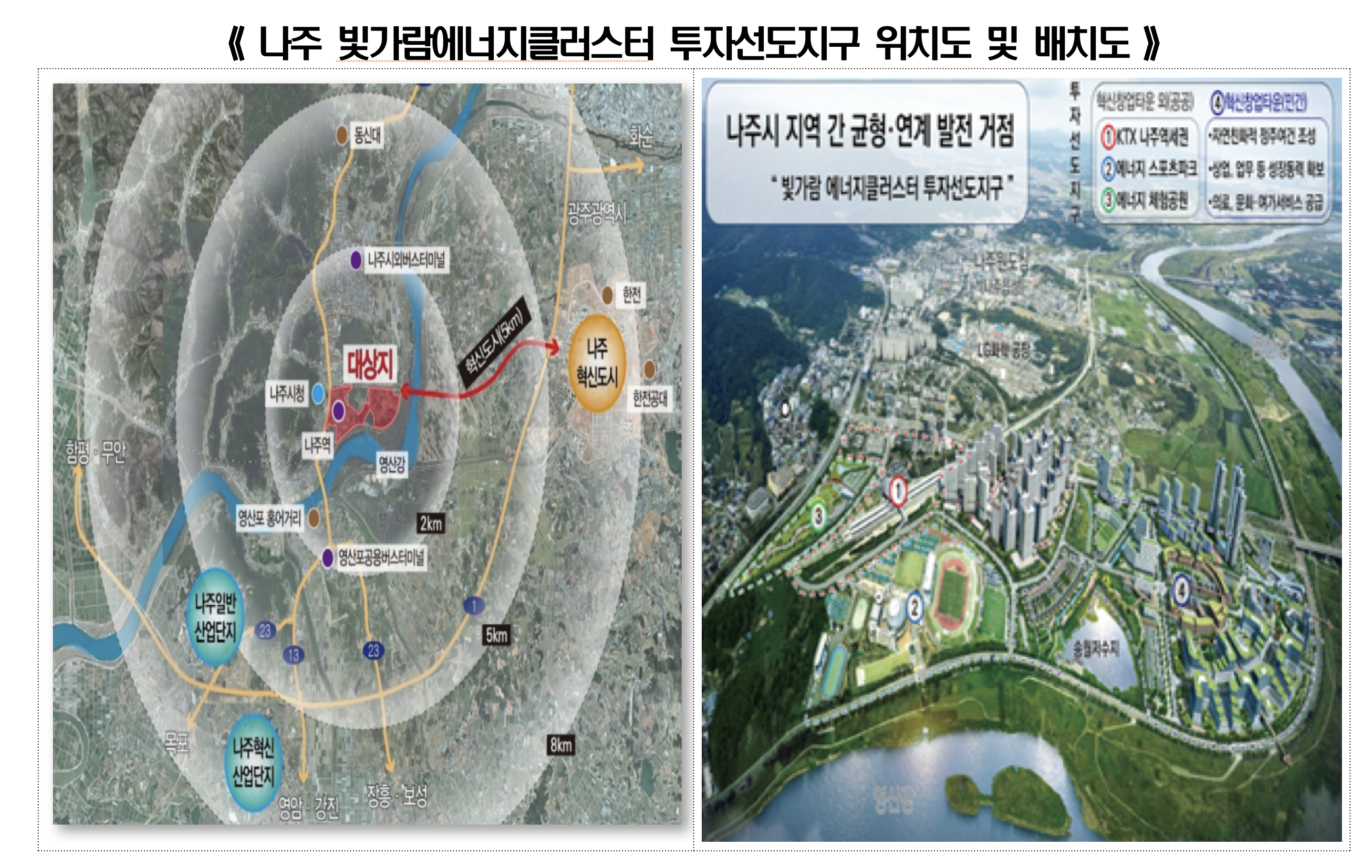 나주 빛가람에너지클러스터 투자선도지구는 민간투자를 통한 자금조달로 나주KTX역 동측에 신규 복합개발을 실시하고, 국비지원으로 주차장, 공원과 같은 기반시설을 조성하는 사업이다.