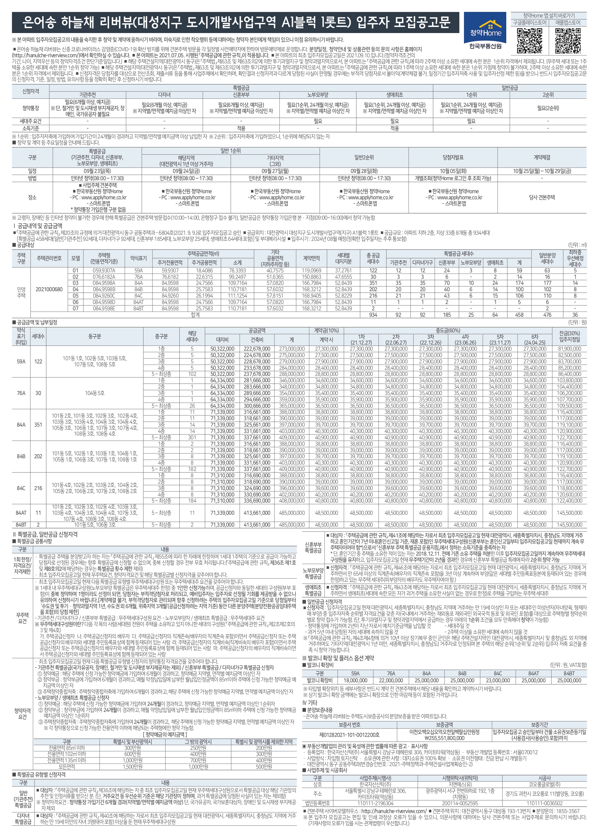 ■ 해당 주택건설지역(대전광역시 동구)은 「주택법」 제63조 및 제63조의2에 의한 투기과열지구 및 청약과열지역으로서, 본 아파트는 「주택공급에 관한 규칙」에 따라 2주택 이상 소유한 세대에 속한 분은 1순위 자격에서 제외됩니다. (무주택 세대 또는 1주 택을 소유한 세대에 속한 분만 1순위 청약 가능)