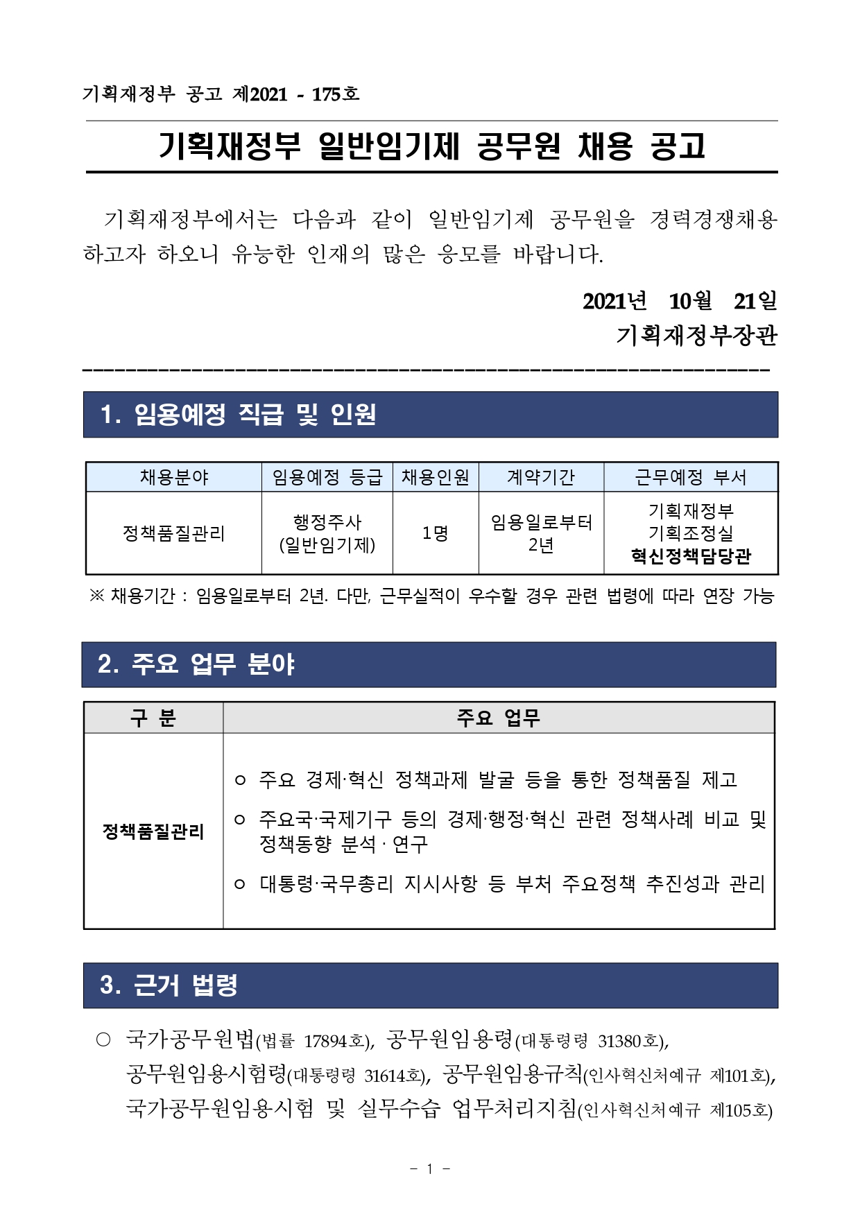 기획재정부에서는 다음과 같이 일반임기제 공무원을 경력경쟁채용 하고자 하오니 유능한 인재의 많은 응모를 바랍니다.