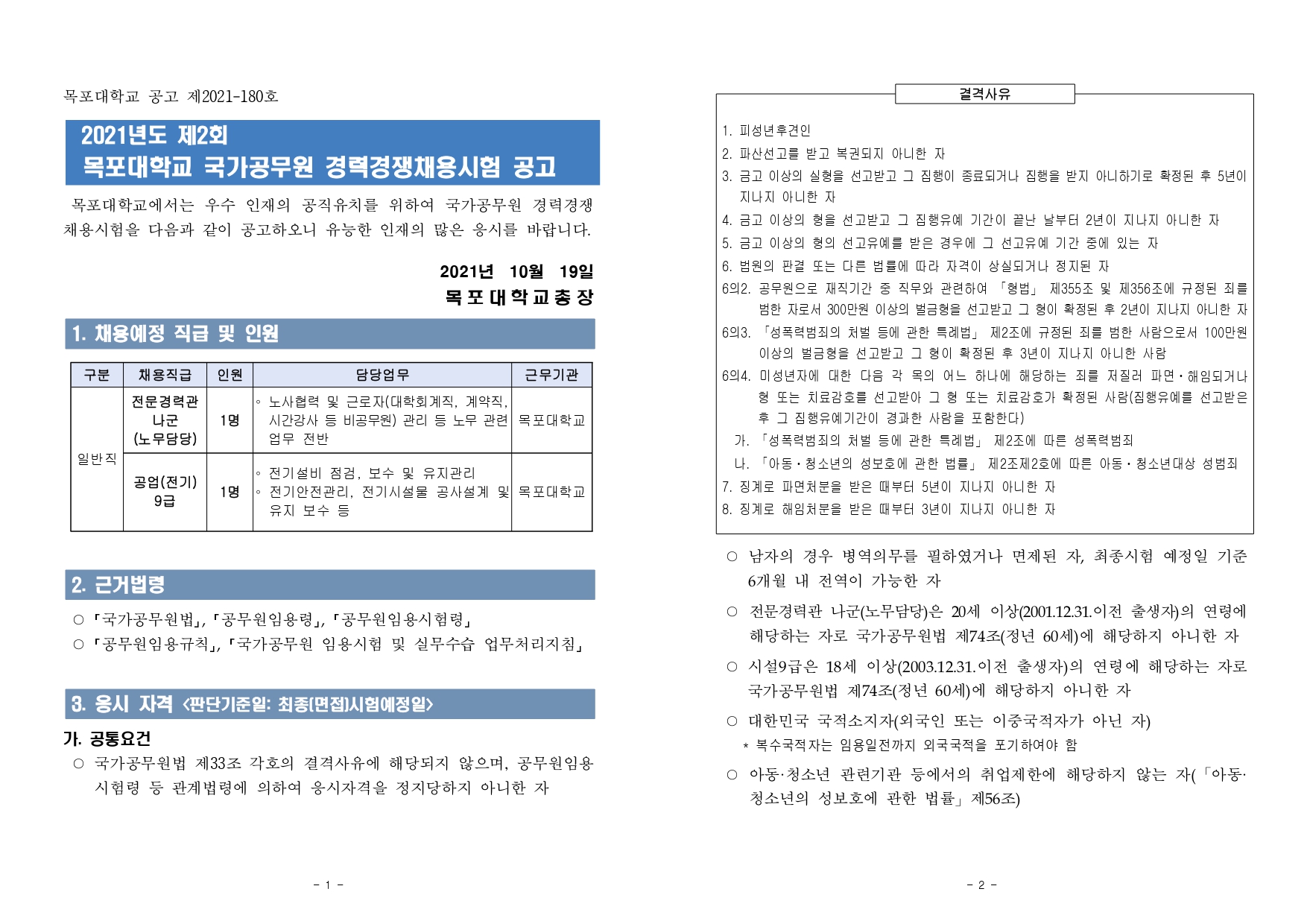 2021년도 제2회 목포대학교 국가공무원 경력경쟁채용시험 공고입니다.