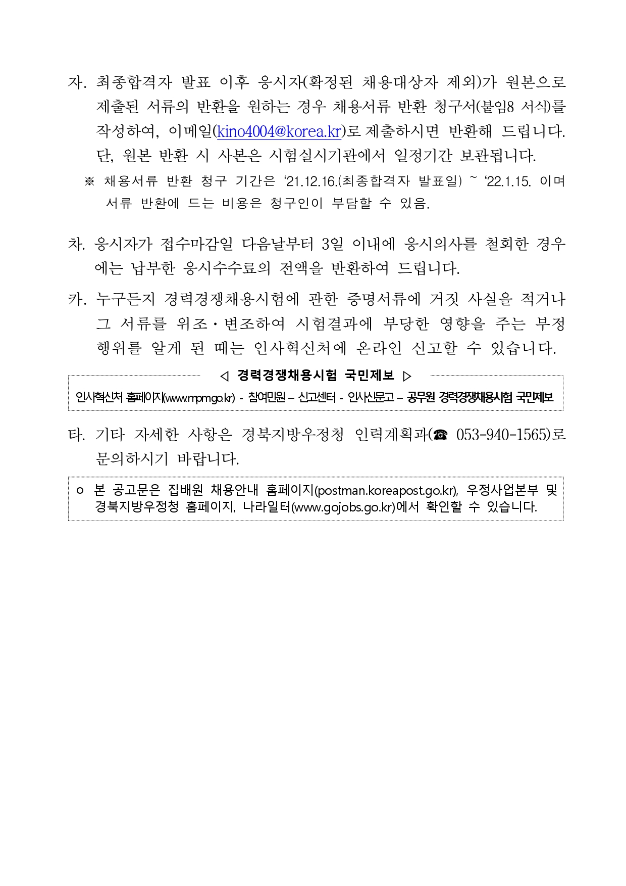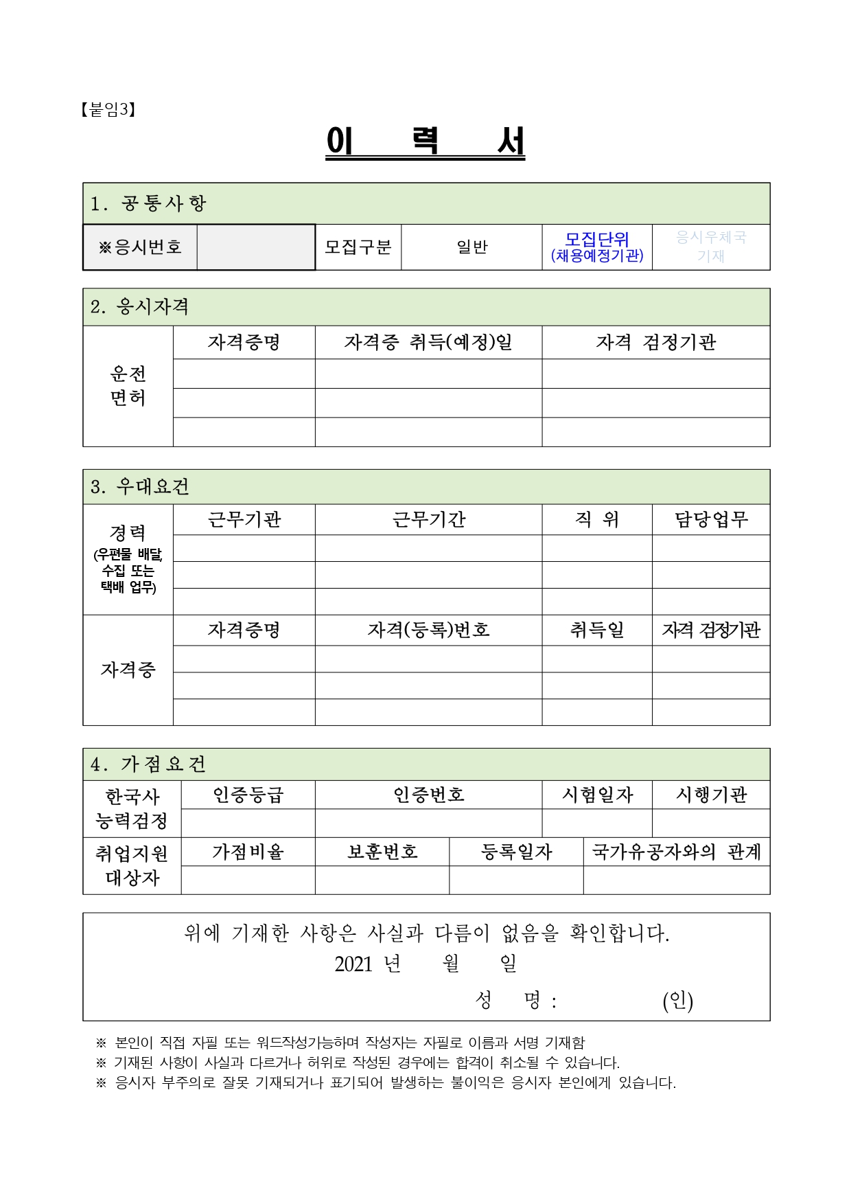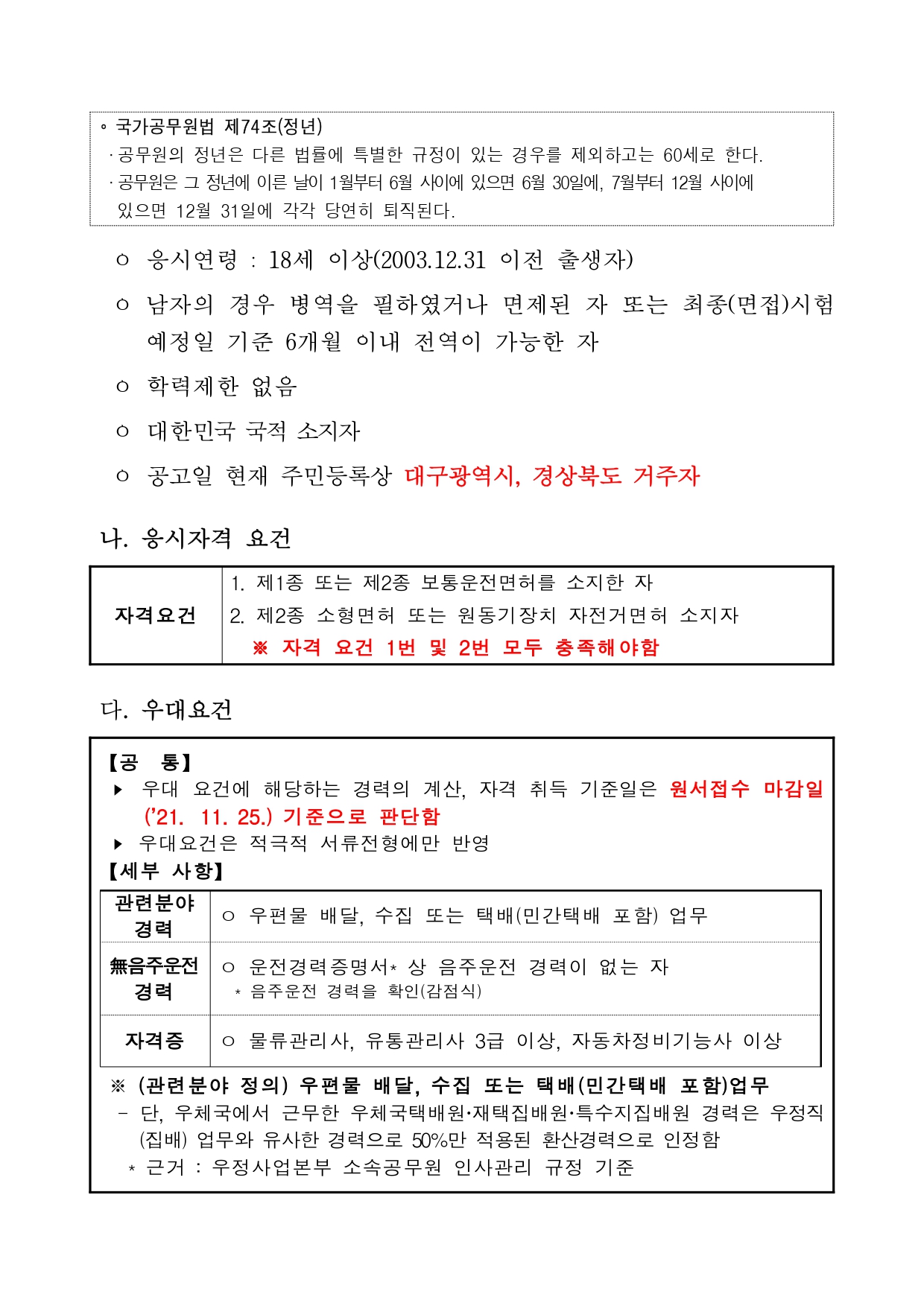 2021년도 제3회 경북지방우정청 우정9급(집배) 공무원 경력경쟁채용시험 공고입니다.