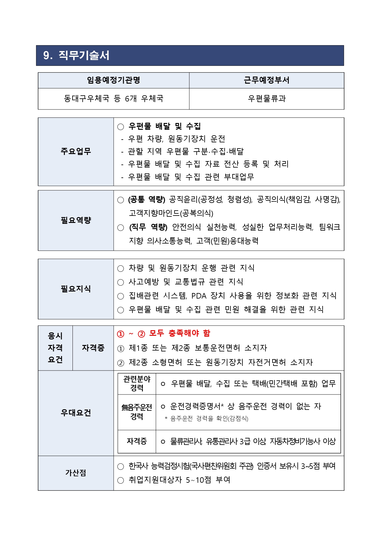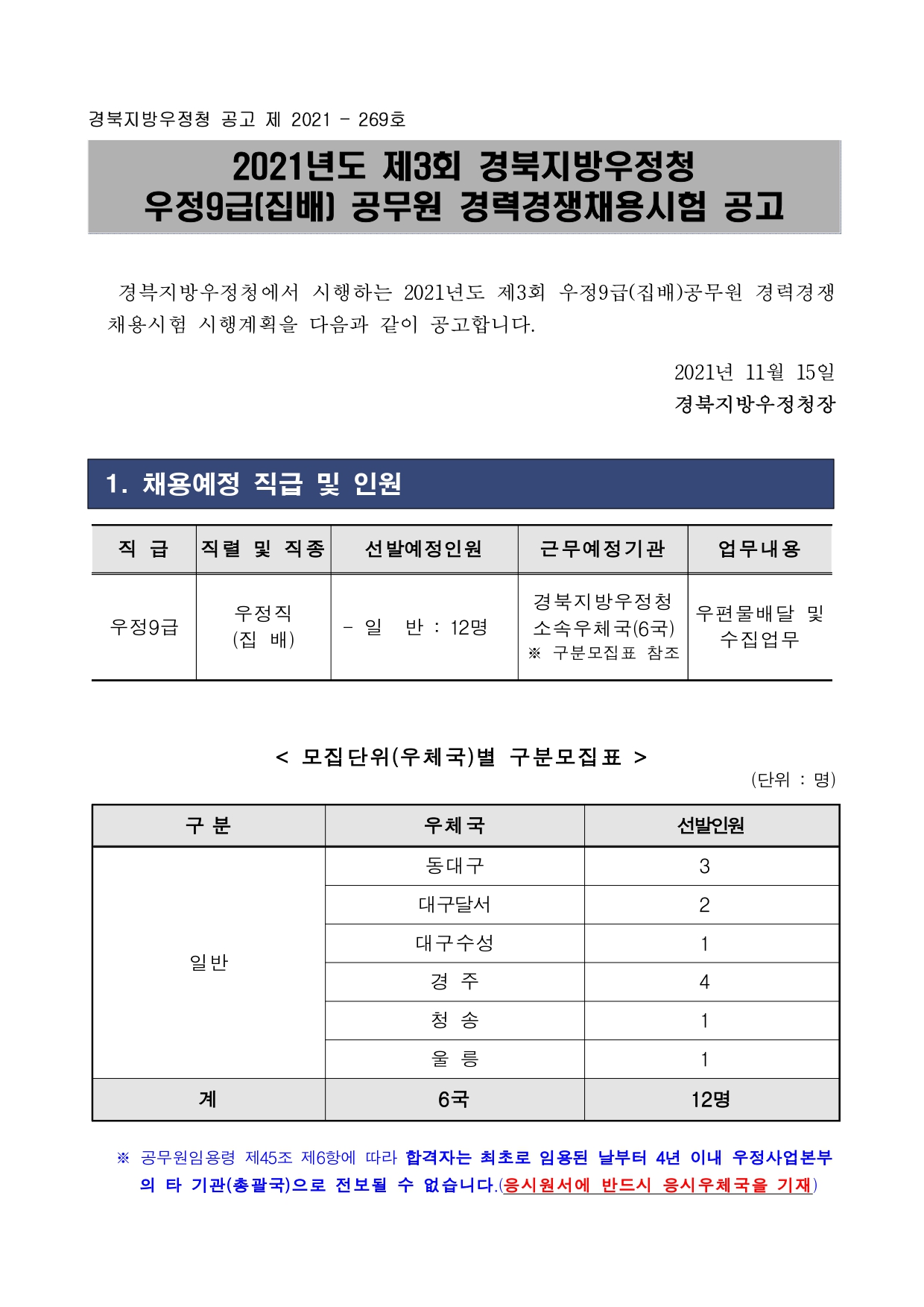 경븍지방우정청에서 시행하는 2021년도 제3회 우정9급(집배)공무원 경력경쟁 채용시험 시행계획을 다음과 같이 공고합니다.