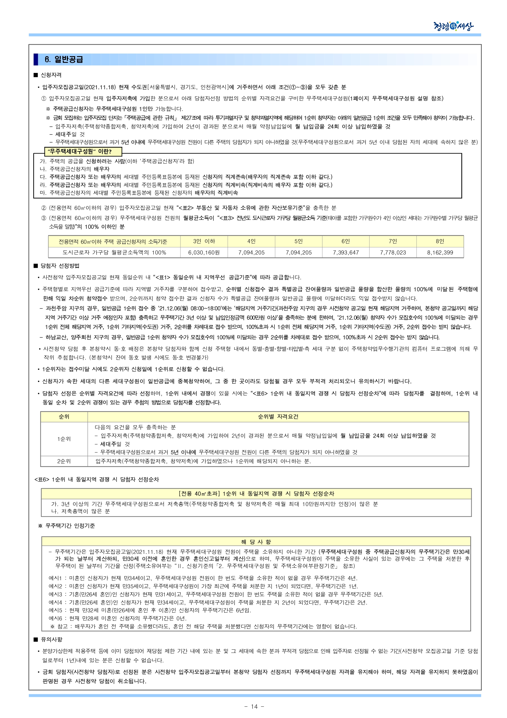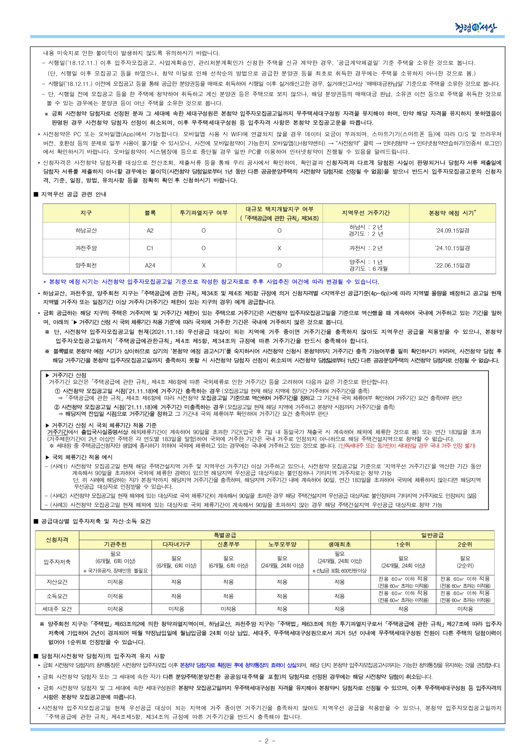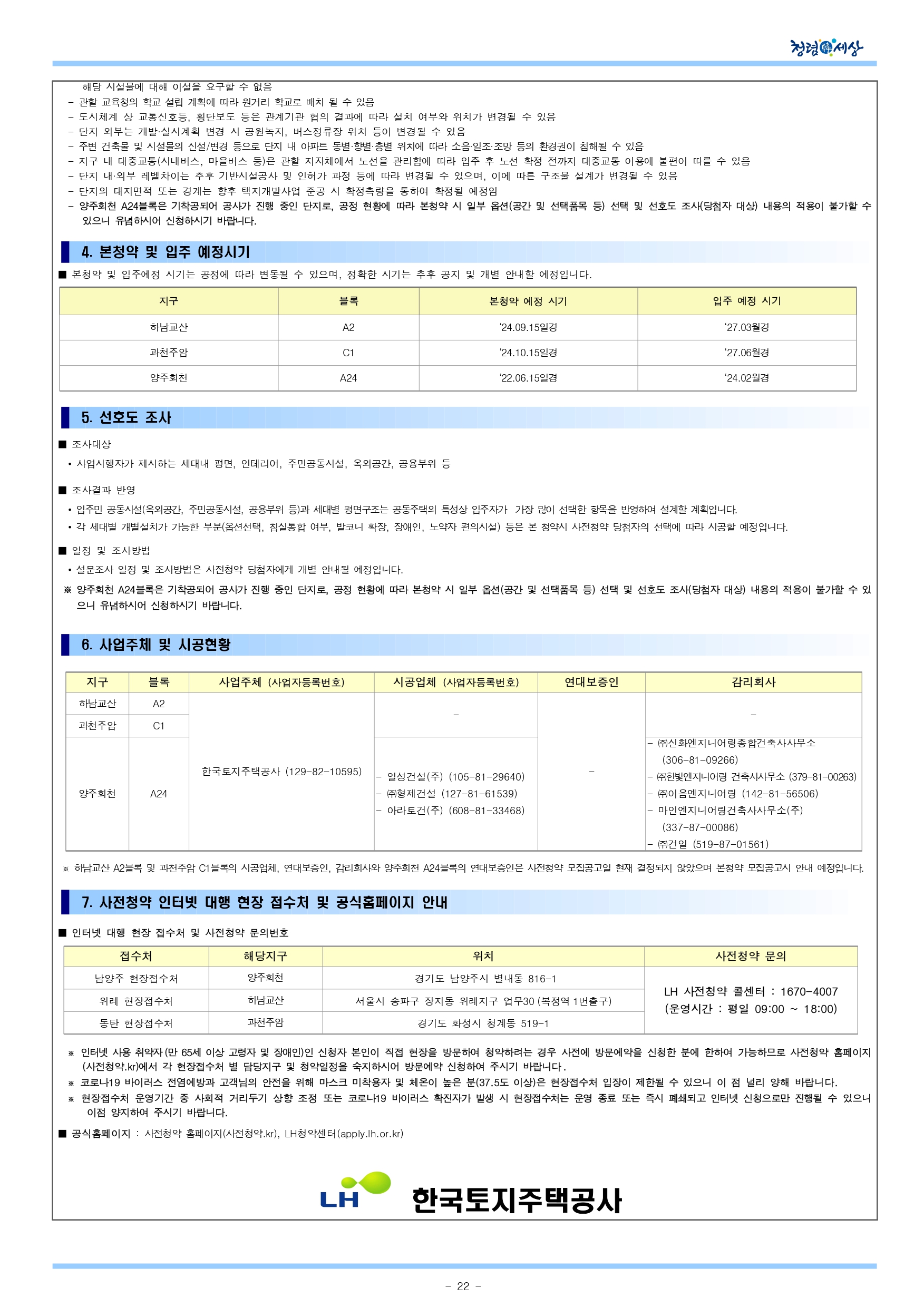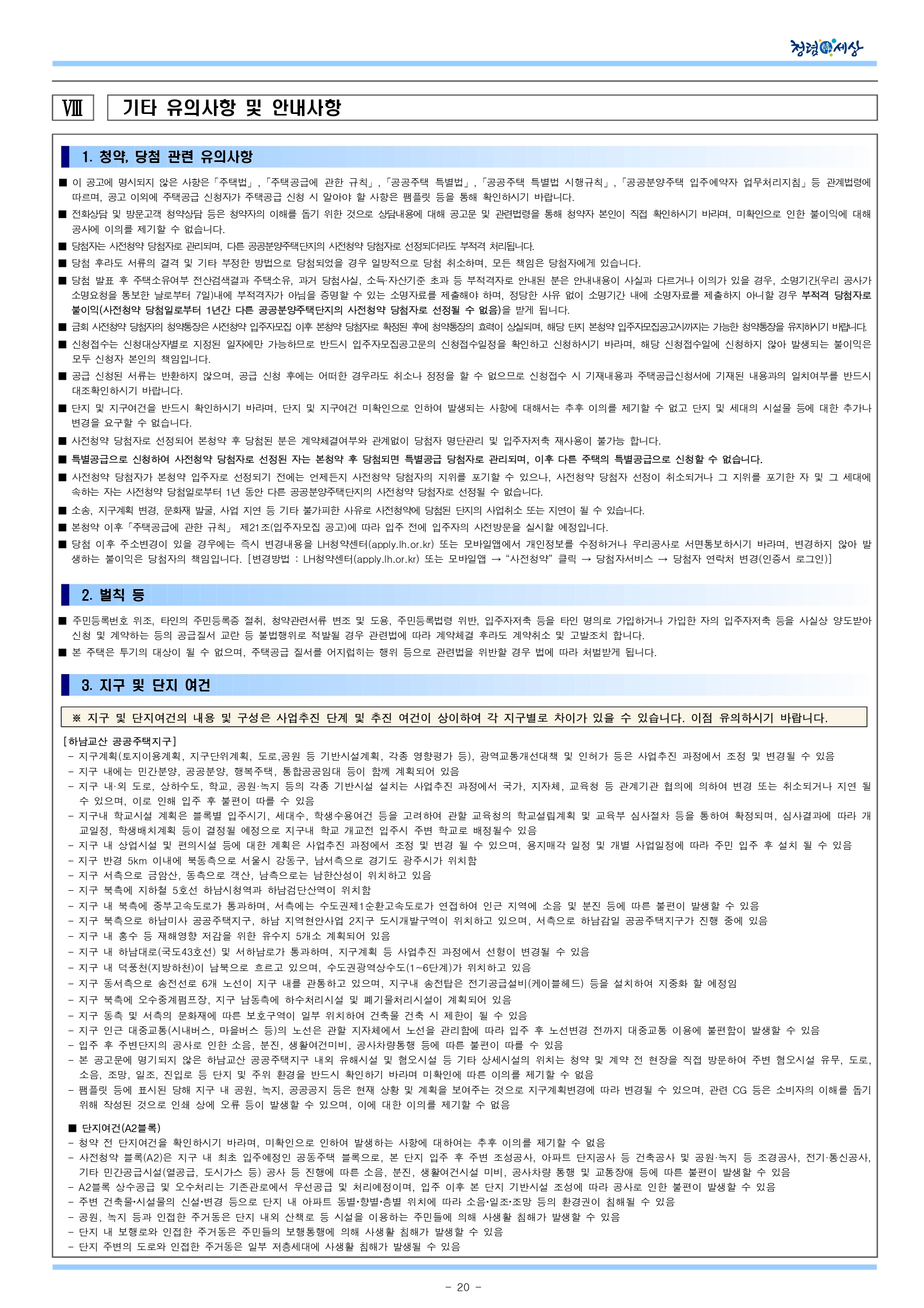 이 공고문은 주택건설사업계획이 확정되지 않은 상태에서 사전청약을 위하여 건설호수, 주택공급면적, 추정분양가격, 세대평면(팸플릿 참조) 등 기본적인 사항을 개략적으로 추정하여 안내 하는 것이므로 본청약 모집공고시 제반 내용이 변경될 수 있음을 충분히 인지하고 신청하시기 바라며, 사업지구 및 단지의 주변 생활여건, 시공관련 사항 등 현재 시점에서 알 수 없거나 확정되지 않은 사항에 대하여 향후 이의를 제기할 수 없습니다.