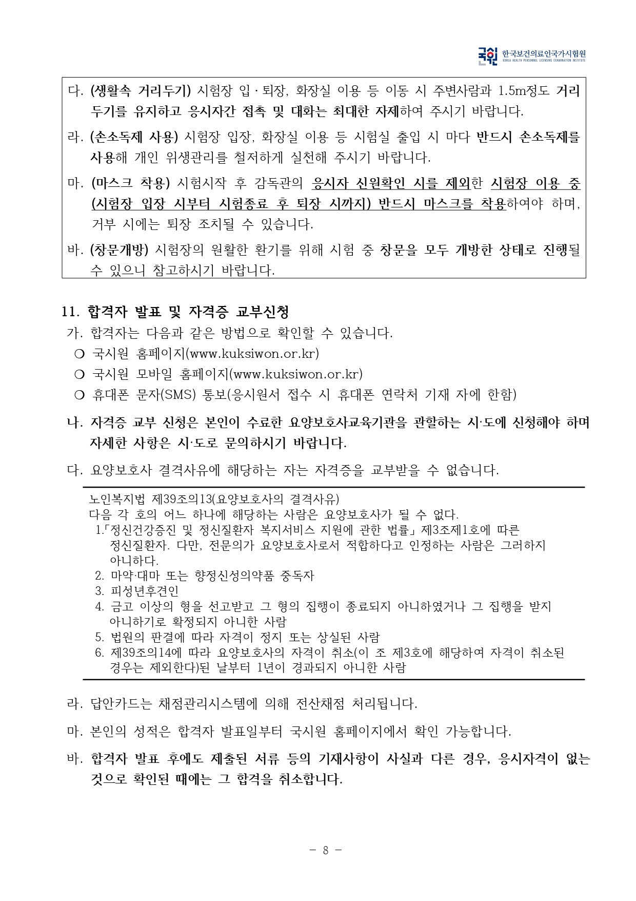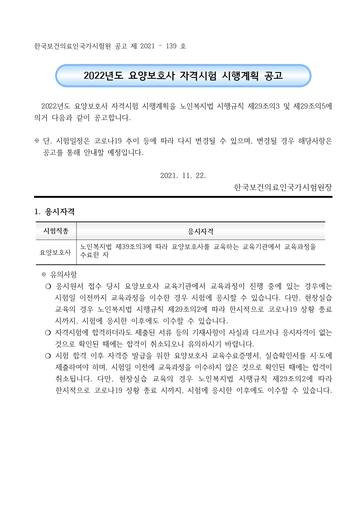 2022년도 요양보호사 자격시험 시행계획을 노인복지법 시행규칙 제29조의3 및 제29조의5에 의거 다음과 같이 공고합니다.