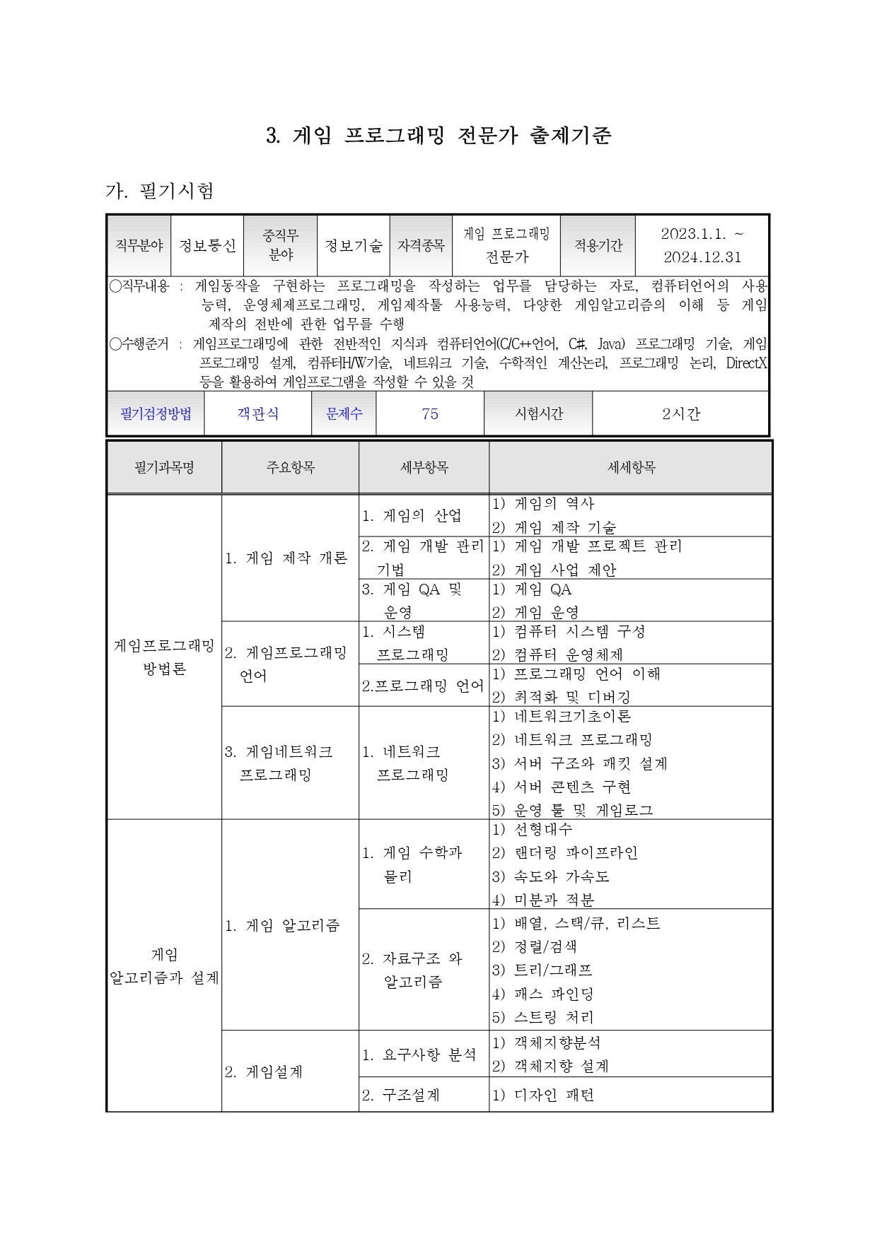 2023년~2024년까지 적용될 게임국가기술자격검정 출제기준을 잘 참고하시기 바랍니다.