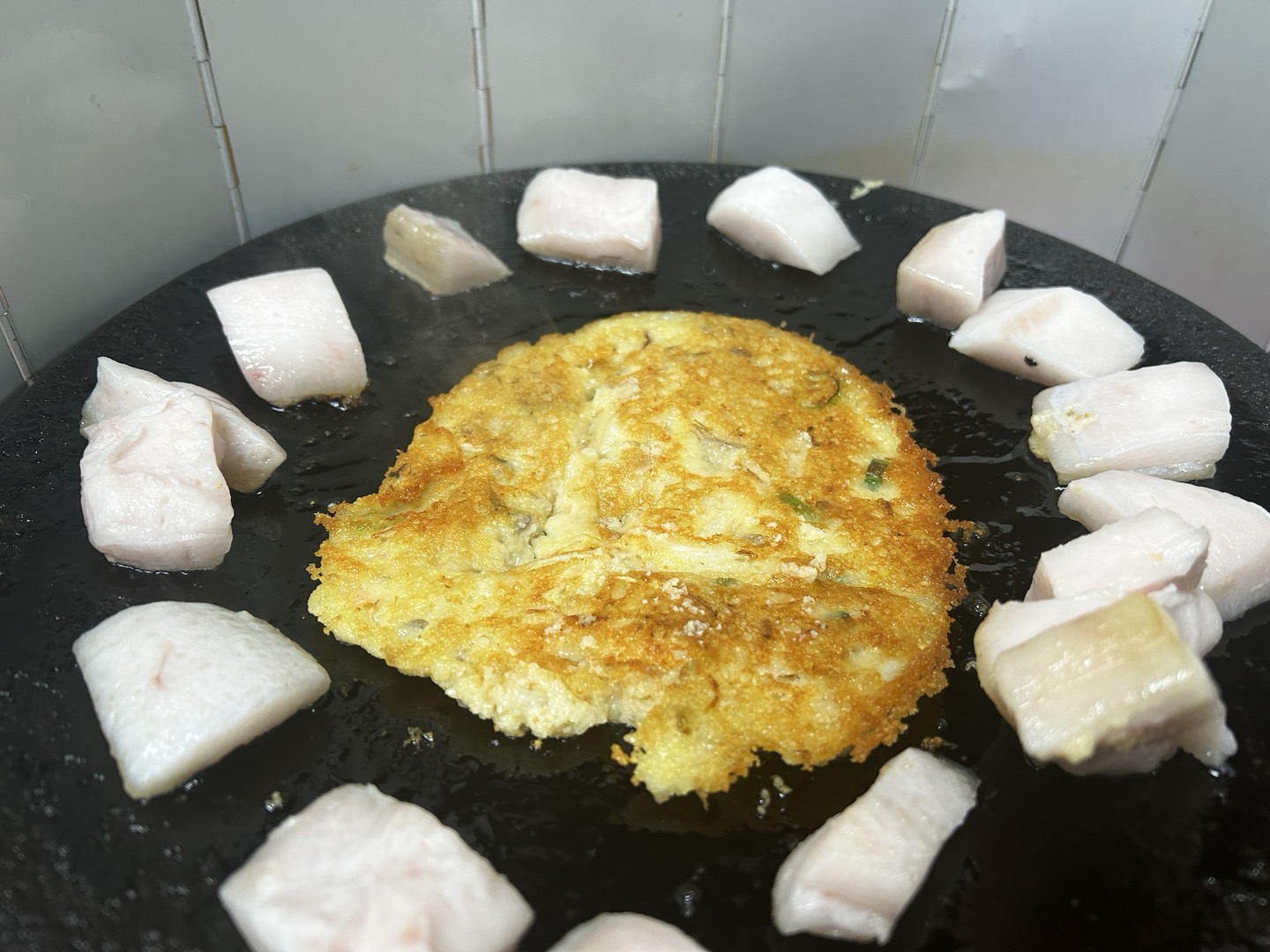 돼지 비계가 흰 번꽃 잎처럼 불판위에 둘러져 있었다.