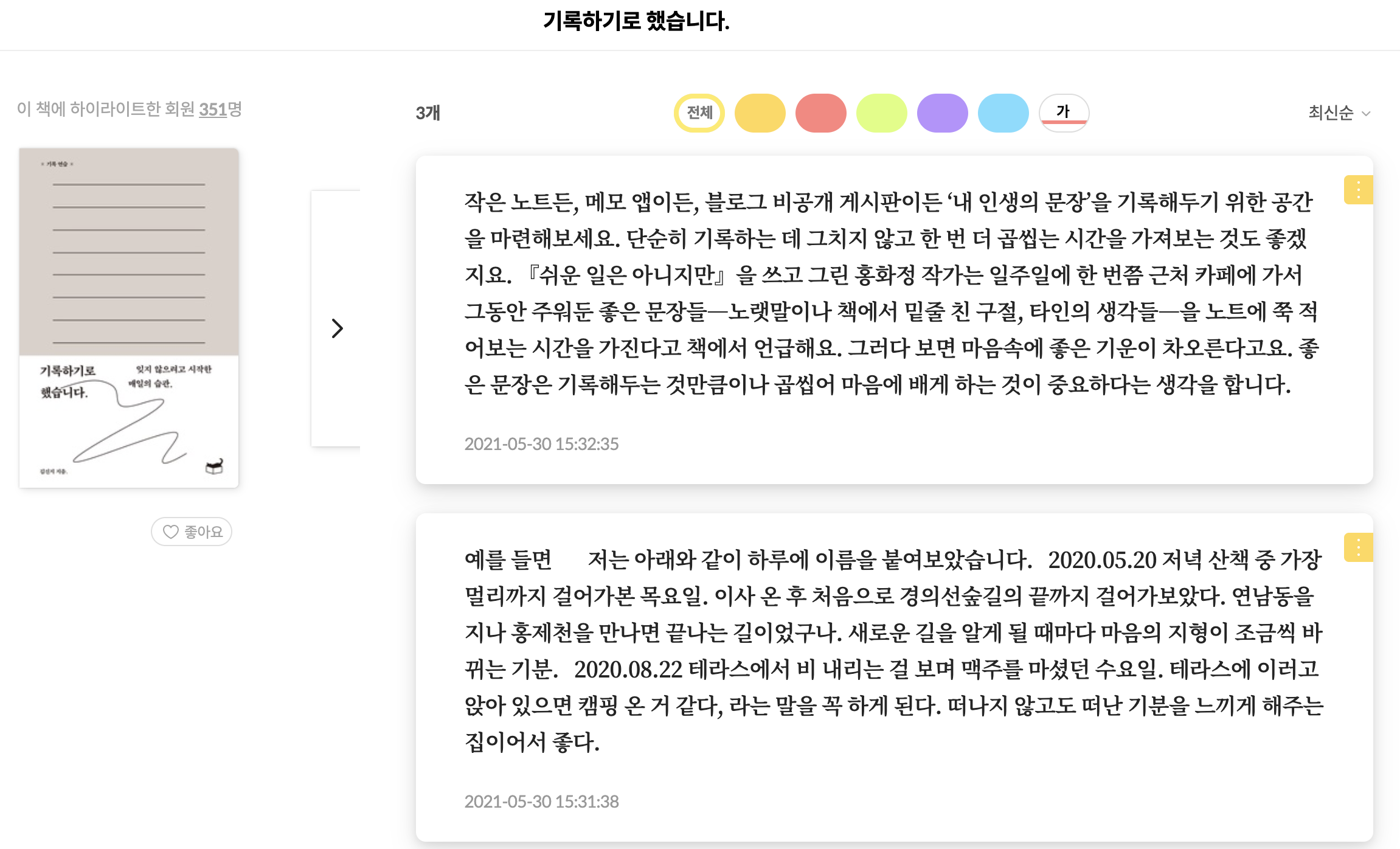 책<기록하기로 했습니다>. 사소한 순간, 일, 감정이라도 기록해놓는다면, 시간이 흐른 후 그 기록은 사소한 의미 이상의 의미를 지닌다. 보통 2~3일 기록을 하다가 귀차니즘때문에 그만두고야 만다. 나도 다시 기록을 시작해볼까.