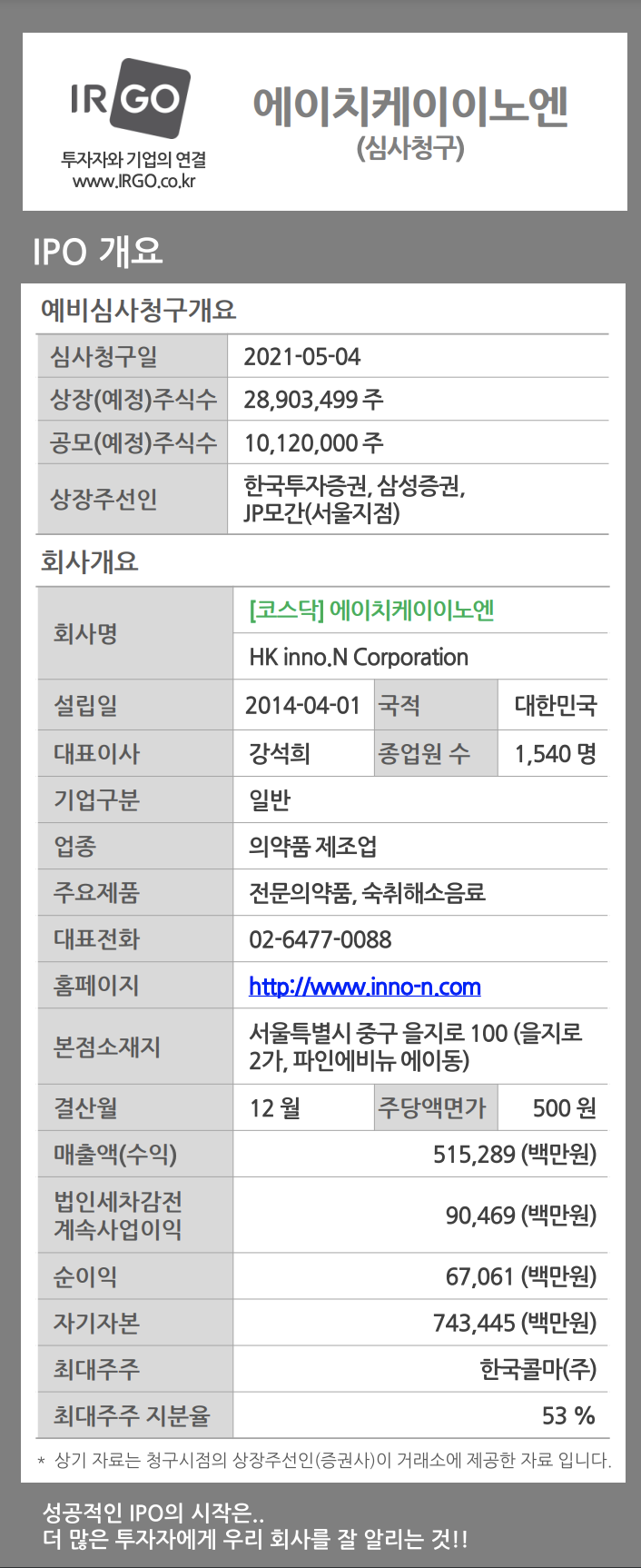 종목명 에이치케이이노엔 진행상황 공모주 시장구분 코스닥 종목코드 195940 업종 의약품 제조업 대표자 강석희 기업구분 중소일반 본점소재지 서울특별시 중구 을지로 100 파