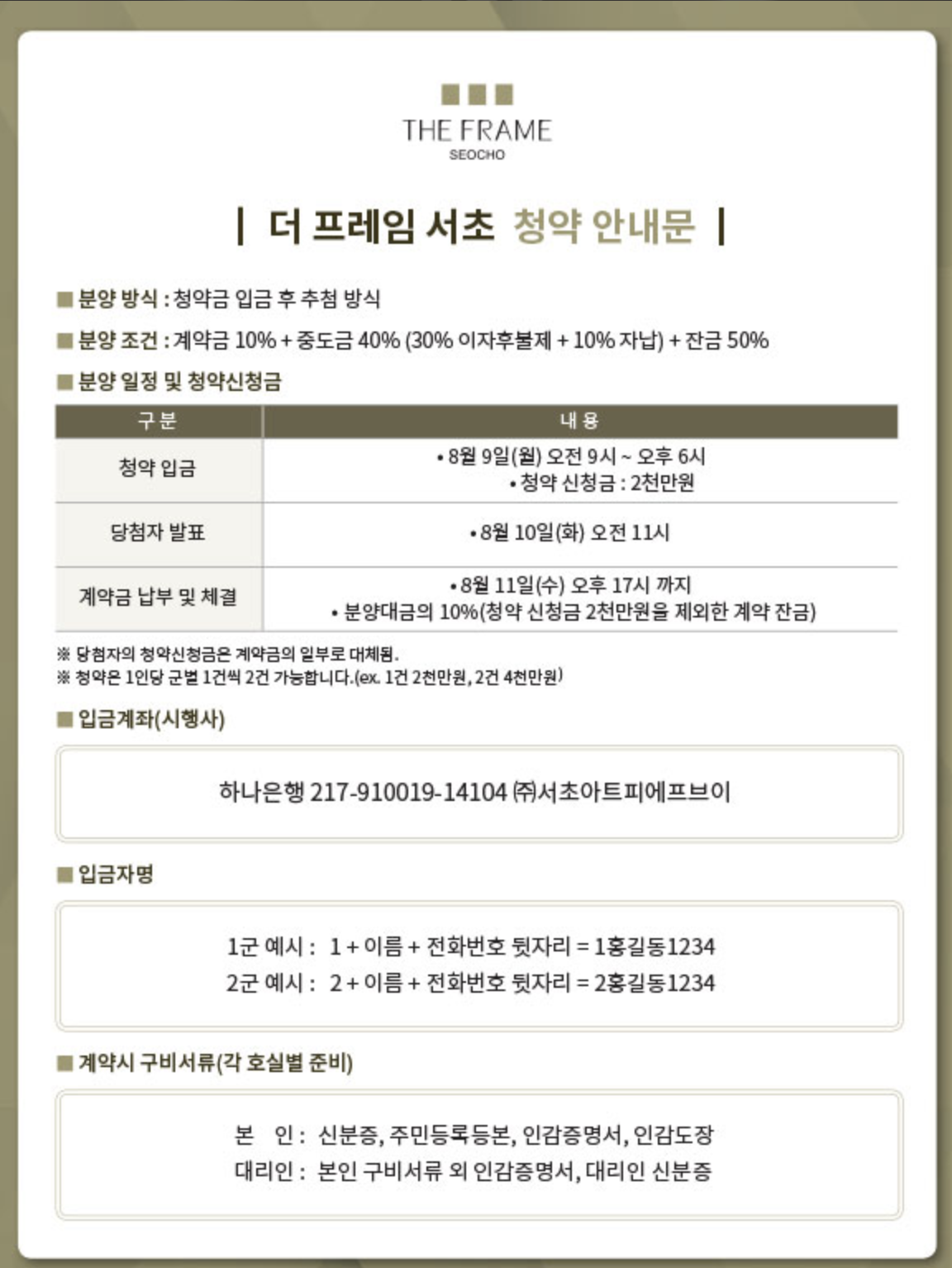 다음은 더프레임 서초 청약일정입니다. 분양 방식은 청약금 입금 후 추첨방식으로 진행됩니다. 자세한 내용은 아래와 같습니다.