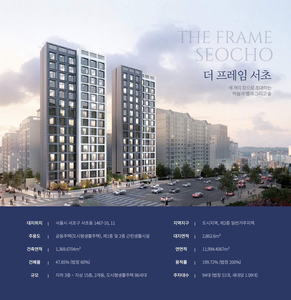 ‘더 프레임 서초’는 A타입 15가구, B타입 15가구, C타입 11가구, D타입 15가구, E타입 15가구, F타입 15가구 등 총 86가구로 이루어졌습니다. 지하 3층~지상 15층 2개 동이며, 전체면적 1만1994㎡ 규모입니다. 주변에는 신세계백화점과 센트럴시티, 뉴코아 등의 쇼핑시설과 서울성모병원이 자리하고 있습니다. 이외에 서초경찰서, 지방법원, 대법원 등 공공기관이 주변에 있습니다.