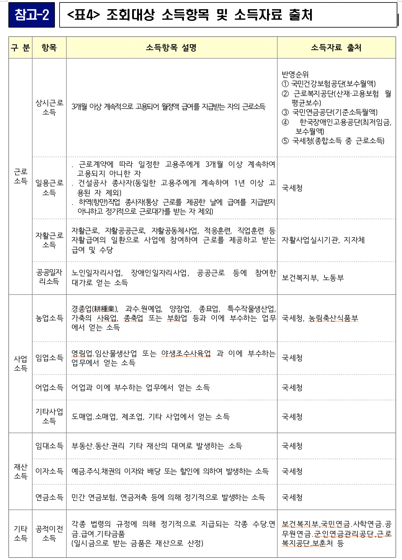 ㅇ 소득 산정은 사회보장정보시스템을 통해 원천정보를 보유한 공공기관으로부터 수집 및 조사한다. 근로소득, 사업소득 등 소득 종류에 따라 소득자료 출처기관이 다르므로 모집공고문 ‘<표4> 조회대상 소득항목 및 소득자료 출처*’를 반드시 확인해야 한다.