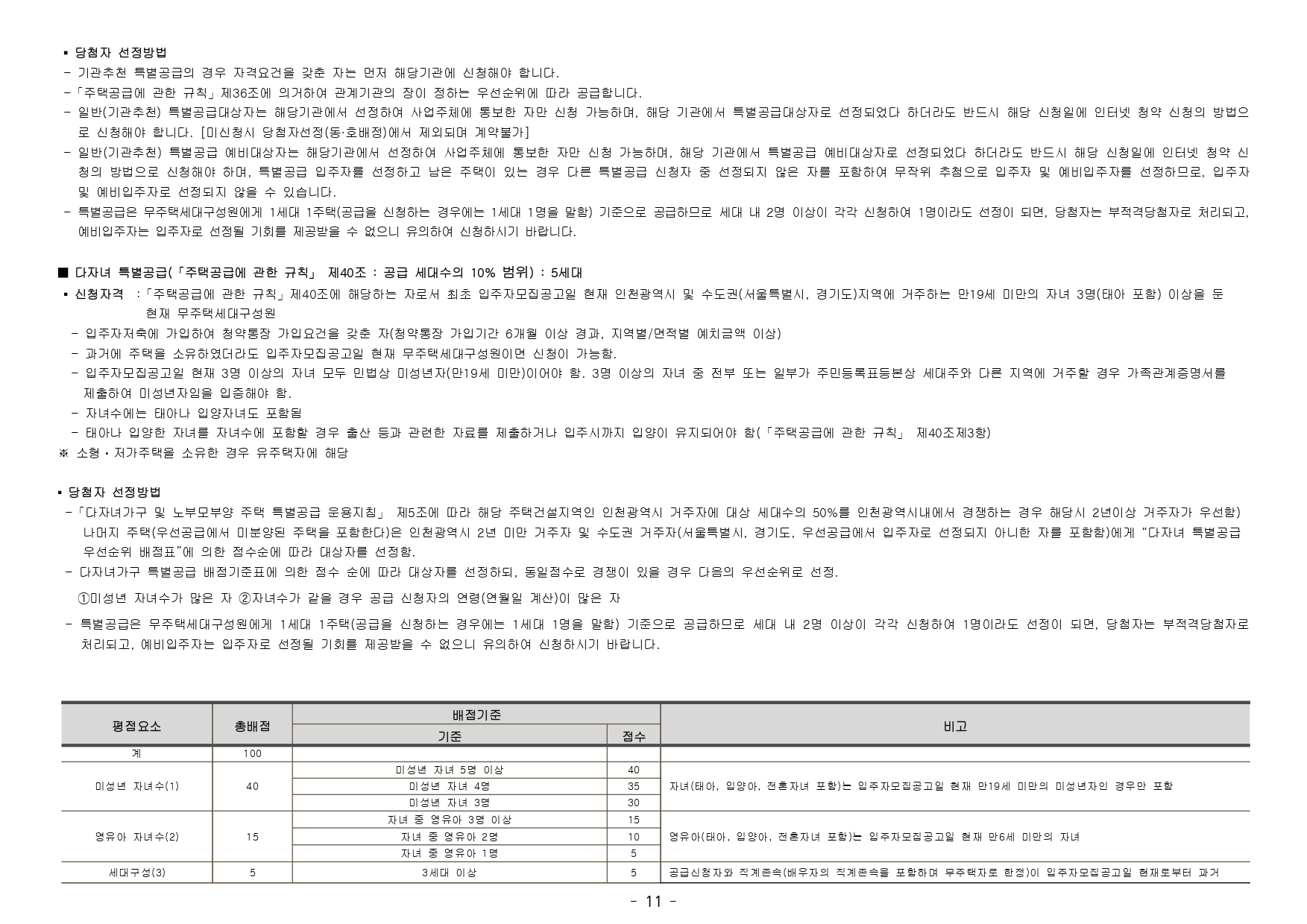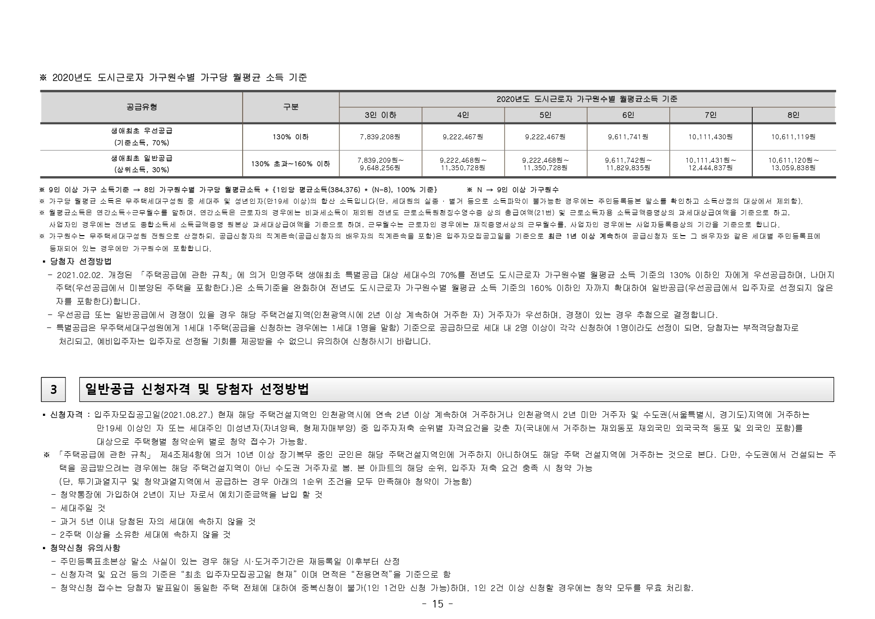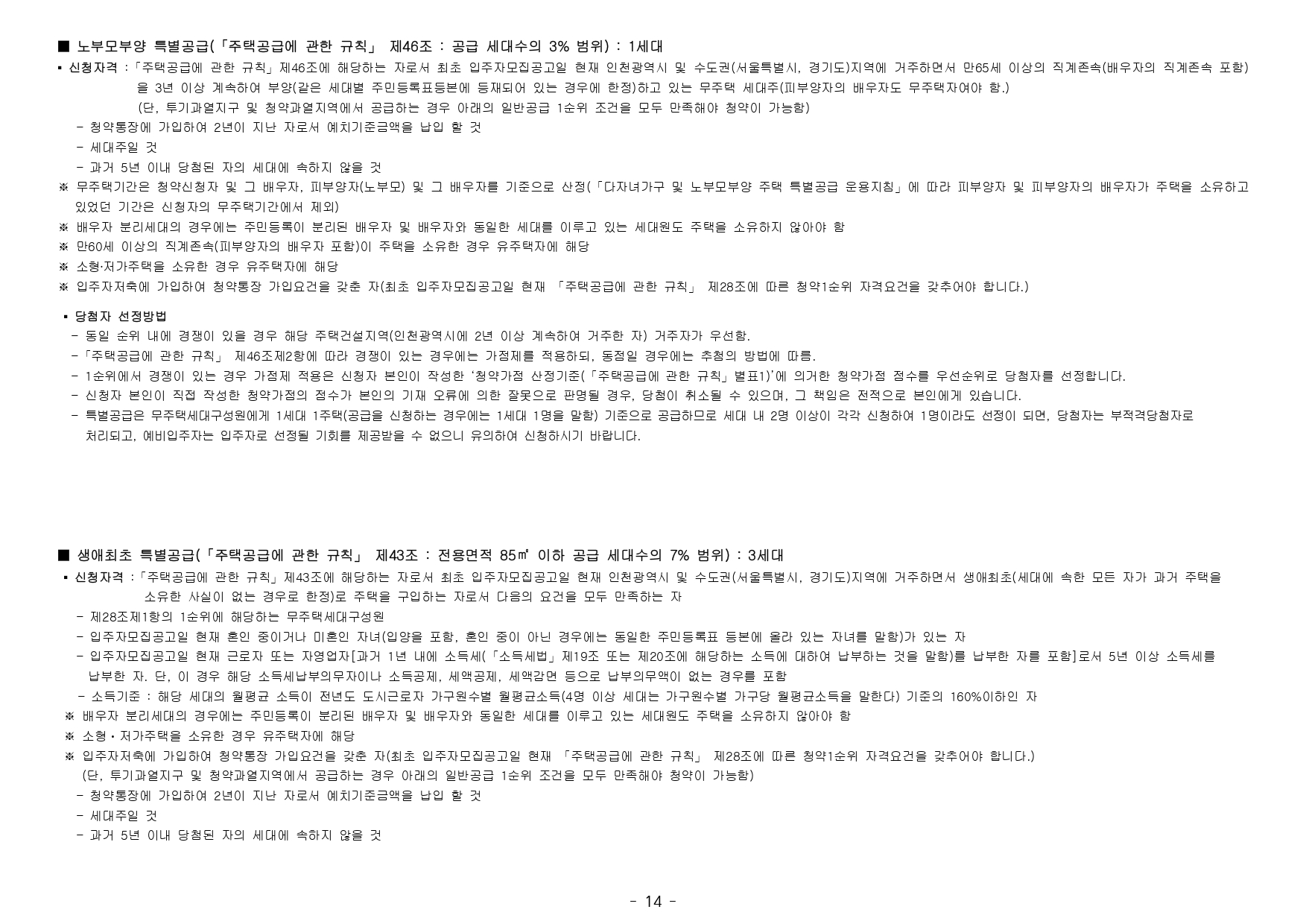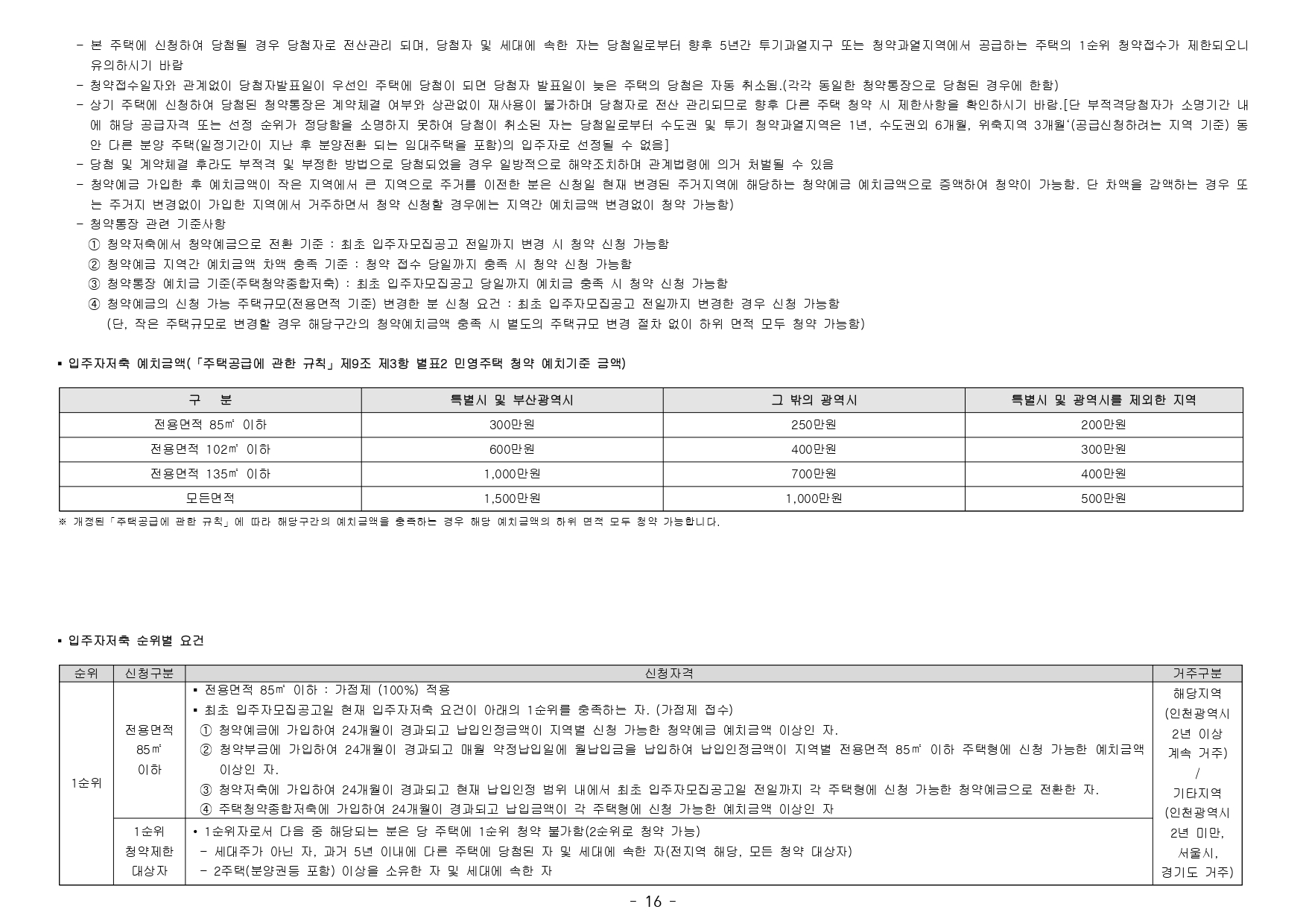 ■ 「주택공급에 관한 규칙」제4조, 제25조에 의거 주택건설지역인 인천시는 물론 수도권(서울특별시, 인천시, 경기도) 거주자까지 확대하여 공급합니다. 단, 동일 신청자격에서 경쟁이 있을 경우, 인천시 2년 이상 계속하여 거주한 신청자가 인천시 2년 미만 거주자 및 수도권(서울특별시, 경기도) 거주신청자보다 우선하며, 인천시 2년 미만 거주자, 수도권(서울특별시, 경기도) 거주신청자로 신청하신 분은 입주자선정 대상에서 제외될 수 있습니다.(인천시 2년 미만 거주 신청자의 경우 1순위 기타 청약일에 청약접수를 하여야함)
