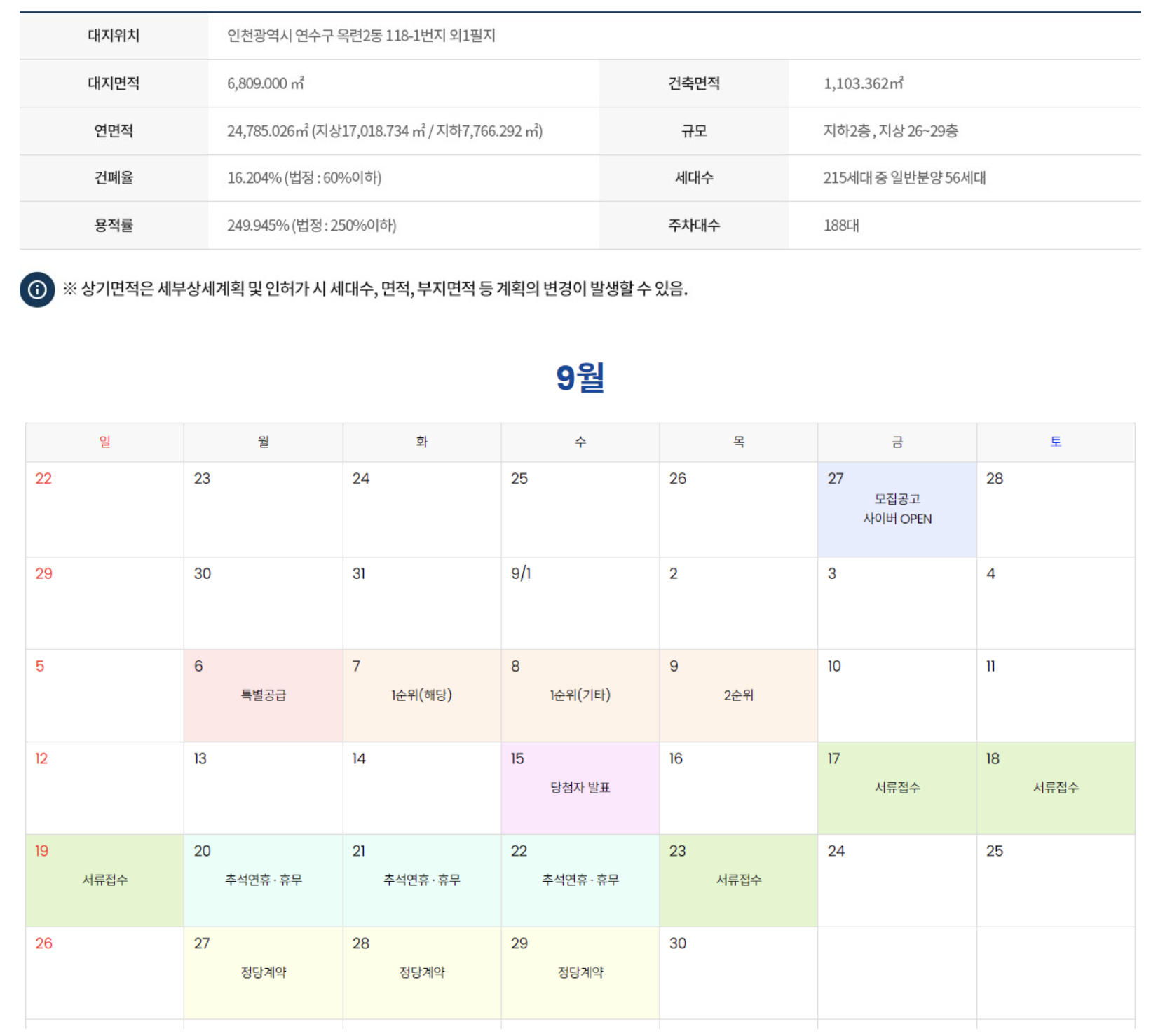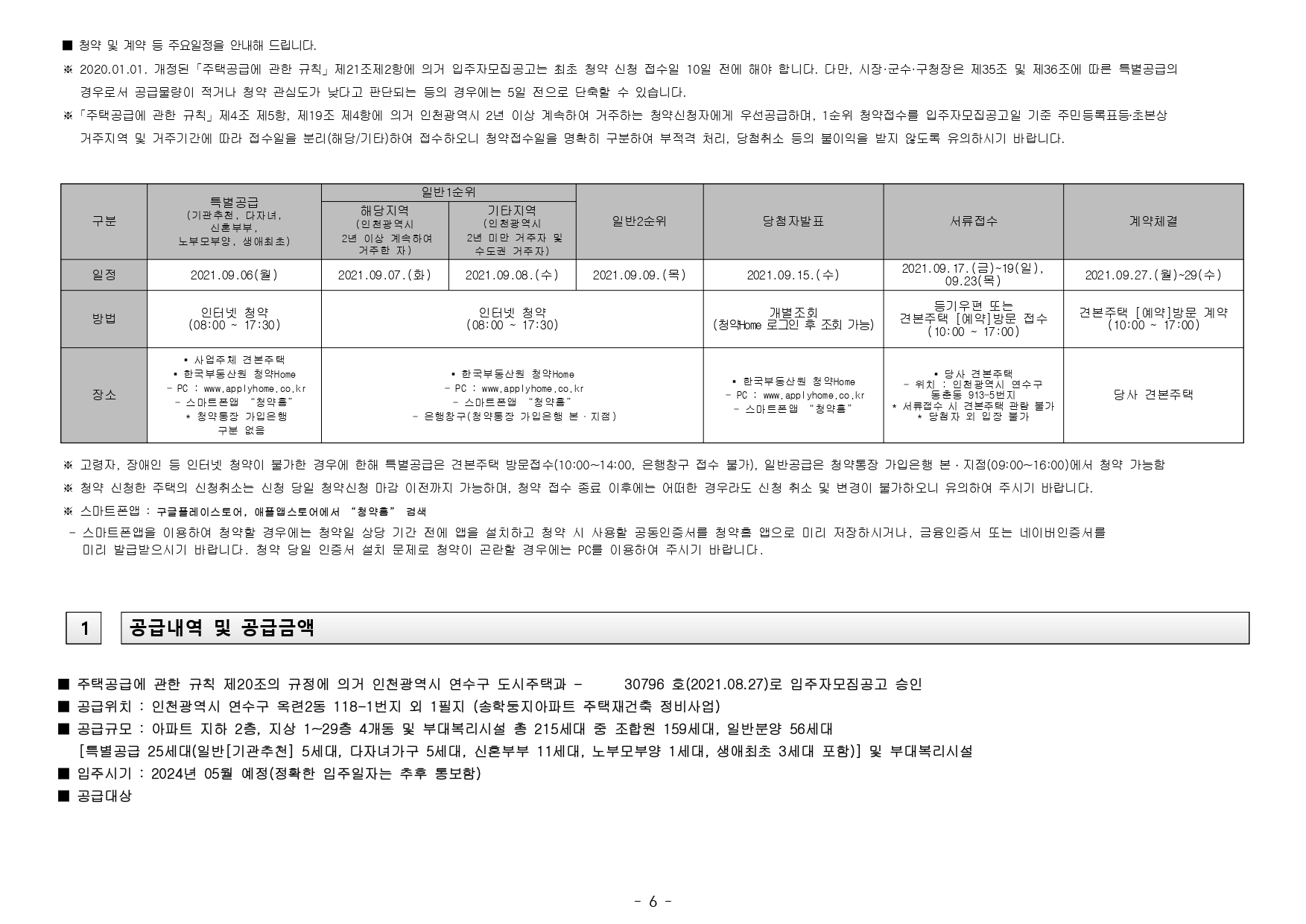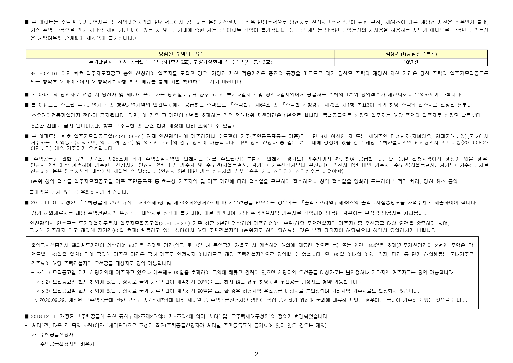 ■ 해당 주택건설지역(인천광역시 연수구)은 「주택법」 제63조 및 제63조의2에 의한 투기과열지구 및 청약과열지역으로서, 본 아파트는 「주택공급에 관한 규칙」에 따라 1주택 이상 소유한 세대에 속한 분은 1순 위 가점제 청약이 불가하며, 2주택 이상 소유한 세대에 속한 분은 1순위 자격에서 제외됩니다.