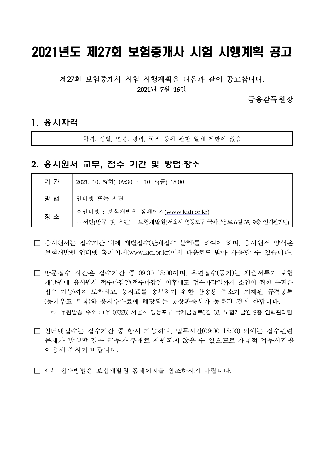 2021년도 제27회 보험중개사 시험 시행계획 공고문 안내입니다.