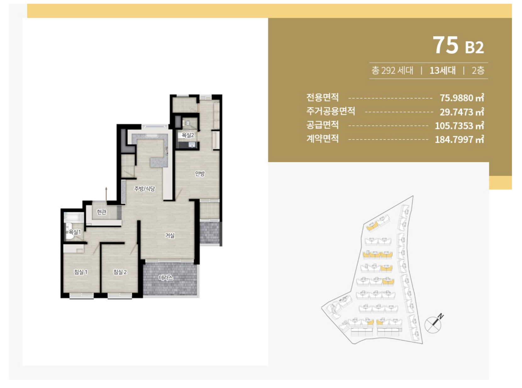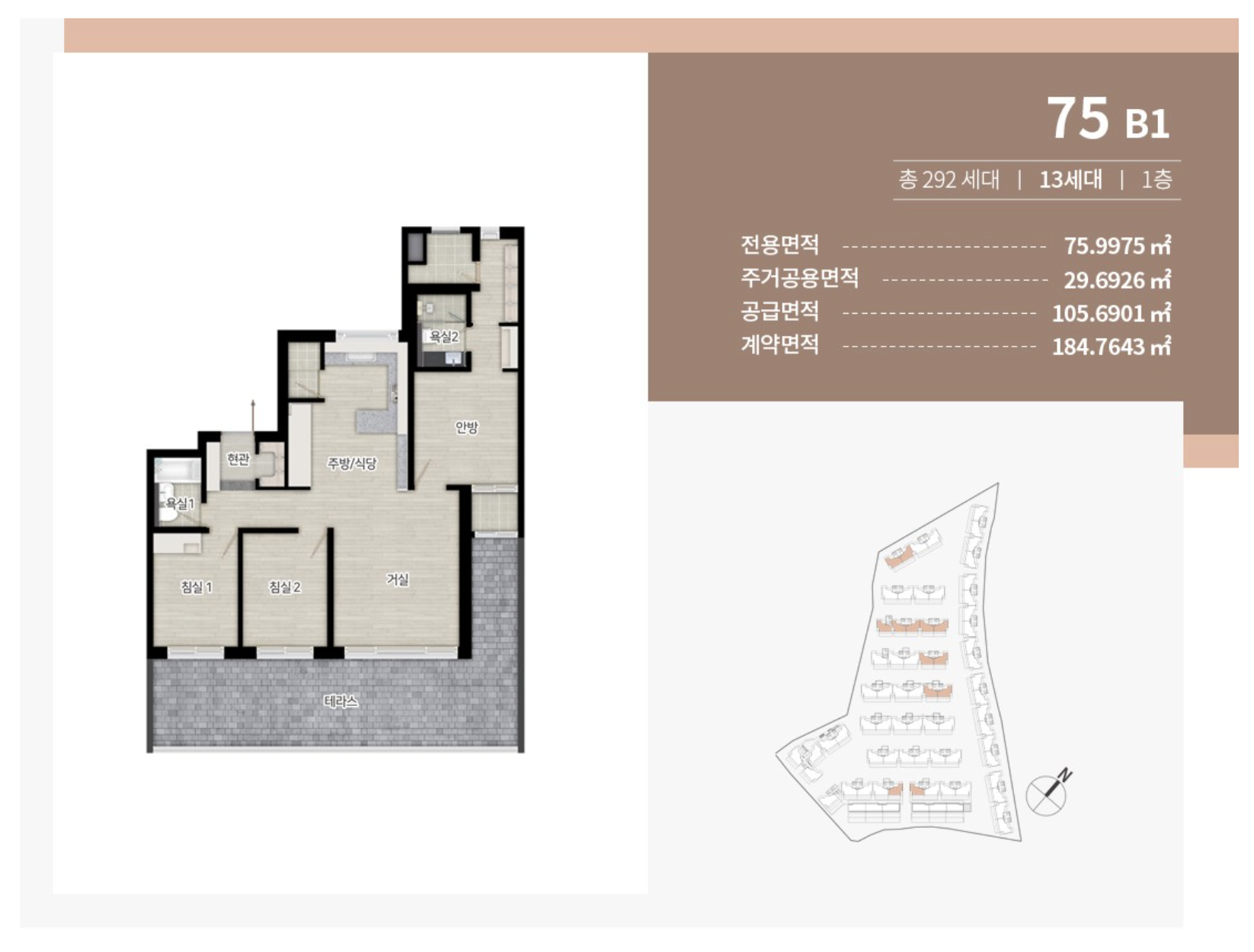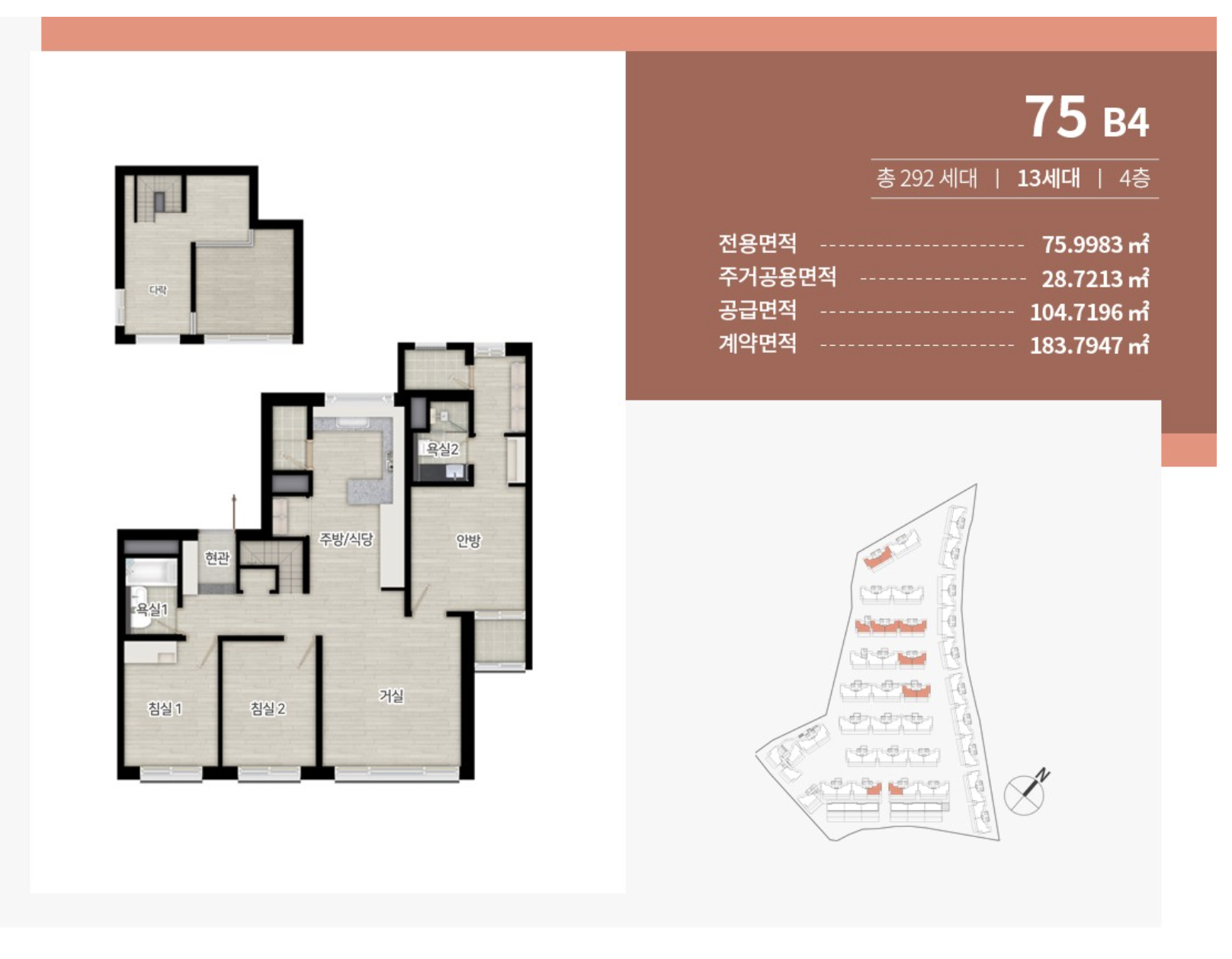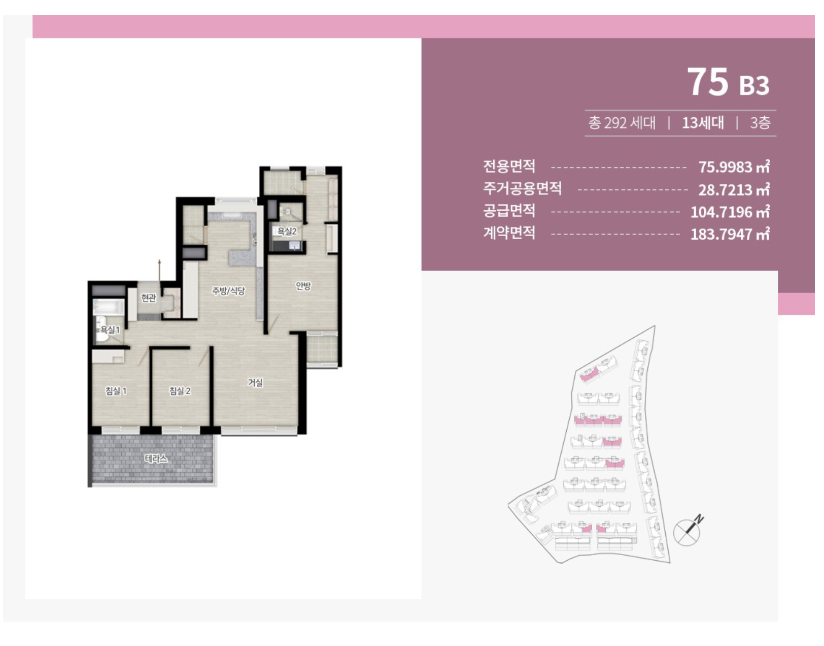 ■ 견본주택에는 84A1, 84A4, 75B2 타입이 설치되어 있으며, 설치되지 않은 그 밖의 타입은 단위세대 모형 등을 참고하시고, 계약 전에 세대 내부, 가구 배치, 실면적 등 견본주택 설치 타입과 다른 사항을 숙지하여 청약 및 계약에 임하시 기 바랍니다.