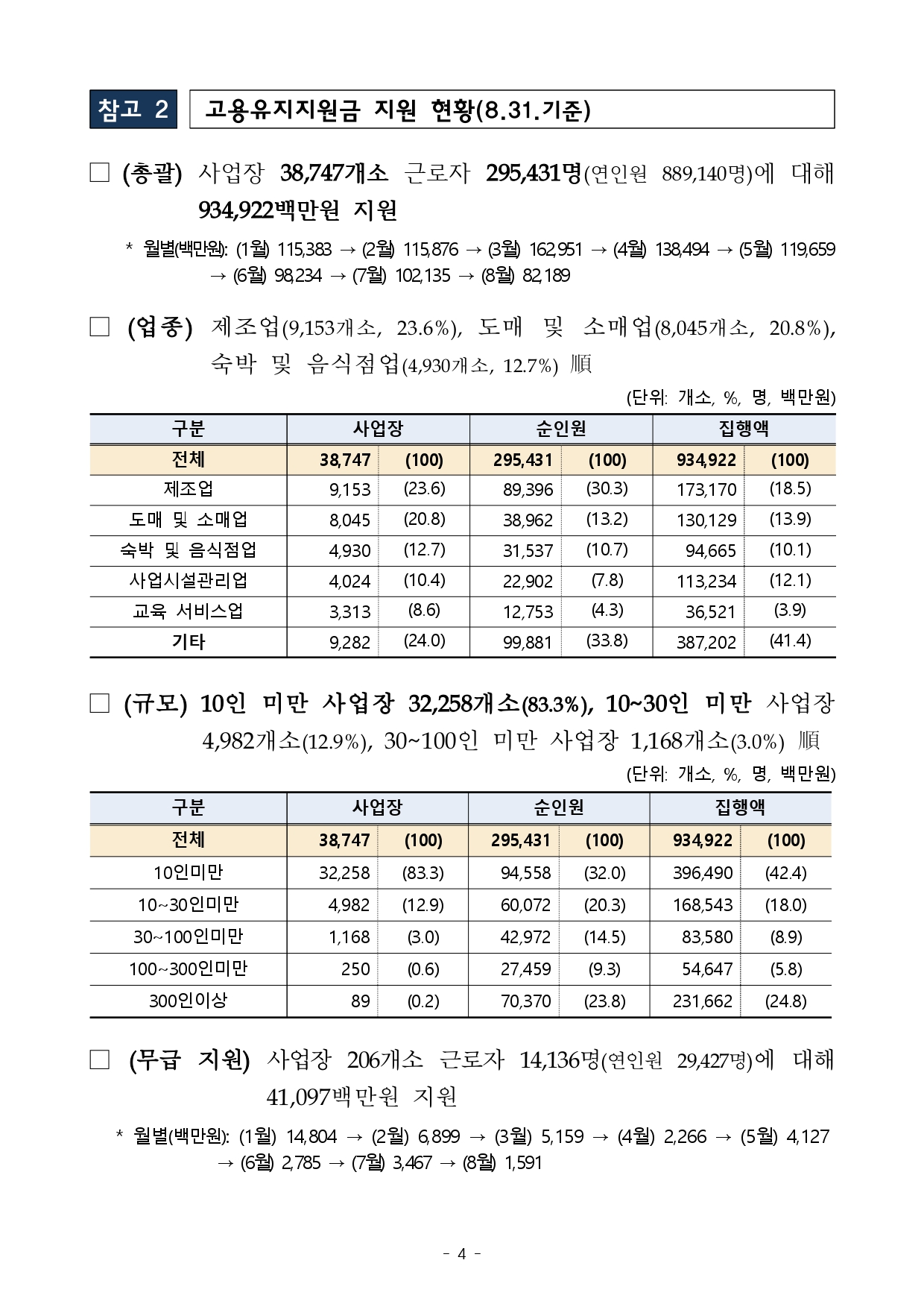 지난해에 이어 올해에도 8월 말까지 사업장 3만 9천개소, 근로자 29.5만명(연인원 89만명)에 대해 9,349억원을 지원하고 있으며, 그간 고용유지지원금은 코로나 확산으로 인한 고용시장 충격을 최소화하여 고용 회복에 기여해 왔다는 평가를 받고 있다.
