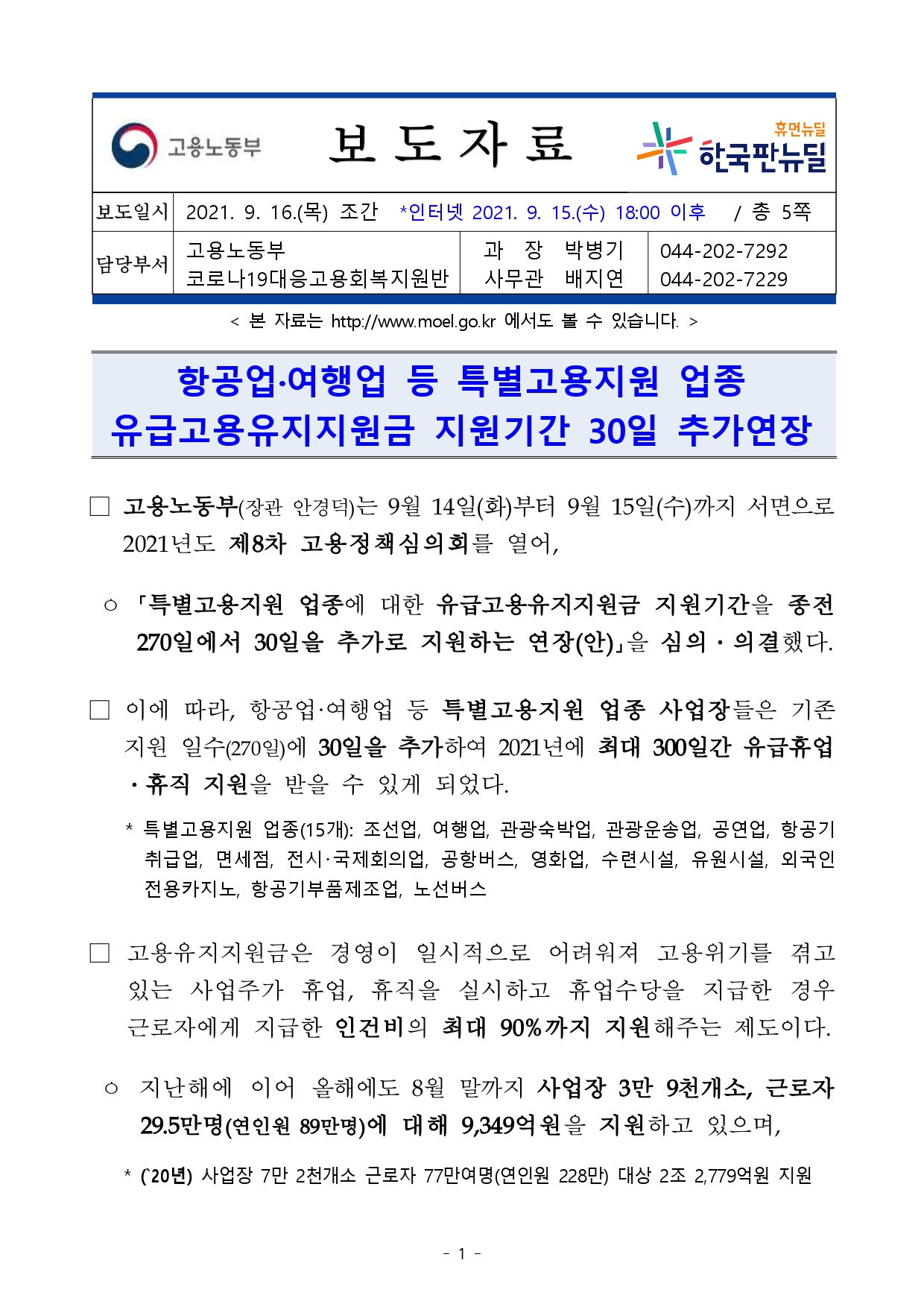 고용노동부(장관 안경덕)는 9월 14일(화)부터 9월 15일(수)까지 서면으로 2021년도 제8차 고용정책심의회를 열어, "특별고용지원 업종에 대한 유급고용유지지원금 지원기간을 종전 270일에서 30일을 추가로 지원하는 연장(안)"을 심의·의결했다.