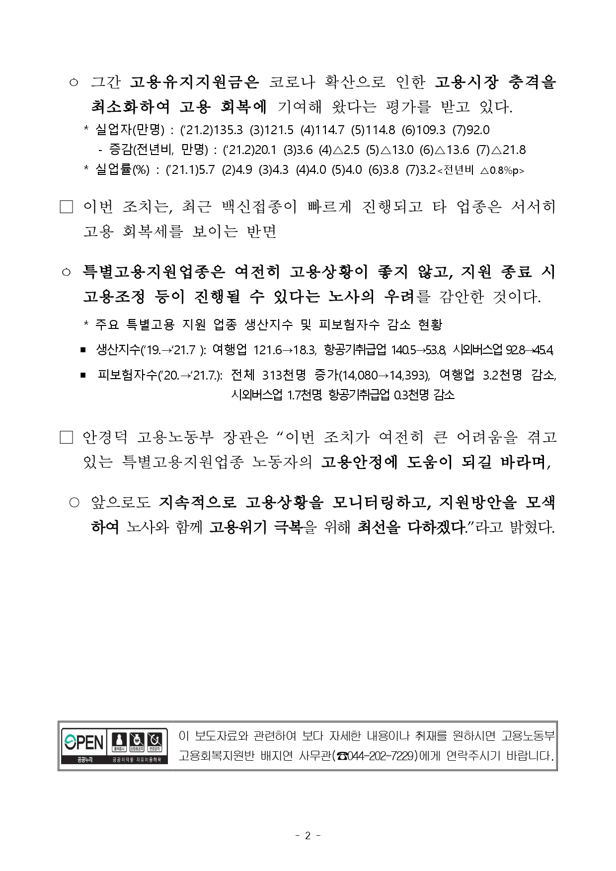 이번 조치는, 최근 백신접종이 빠르게 진행되고 타 업종은 서서히 고용 회복세를 보이는 반면 특별고용지원업종은 여전히 고용상황이 좋지 않고, 지원 종료 시 고용조정 등이 진행될 수 있다는 노사의 우려를 감안한 것이다.