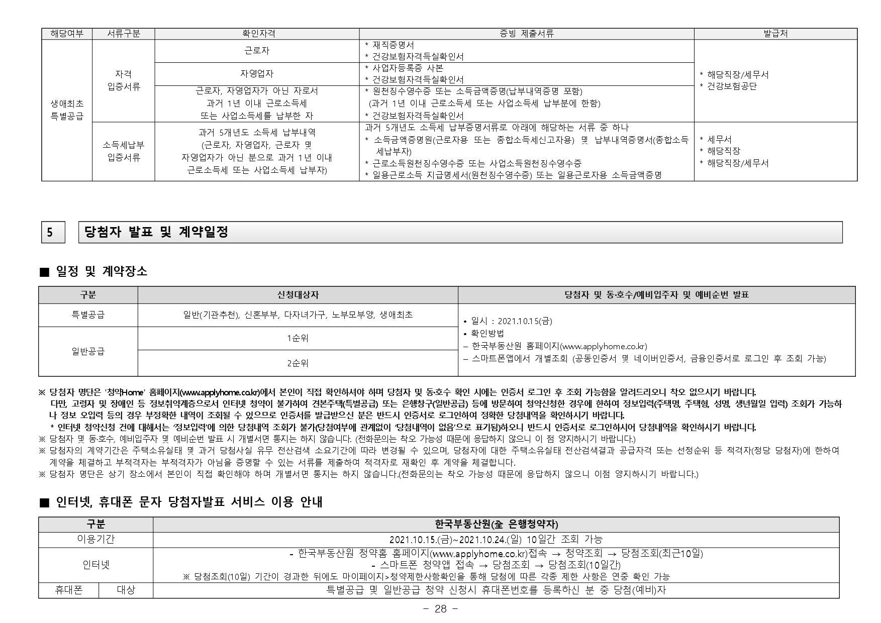 - 재당첨 제한 : 본 아파트의 당첨자로 선정된 자 및 세대에 속한 자는 당첨 주택형별 재당첨 제한 기간 내에 다른 분양주택(분양전환공공임대주택을 포함하되, 투기과열지구 및 청약과열지역이 아닌 지역 에서 공급되는 민영주택은 제외한다)의 입주자로 선정될 수 없습니다. (향후 「주택법」 및 관계법령 개정에 따라 조정될 수 있음)
