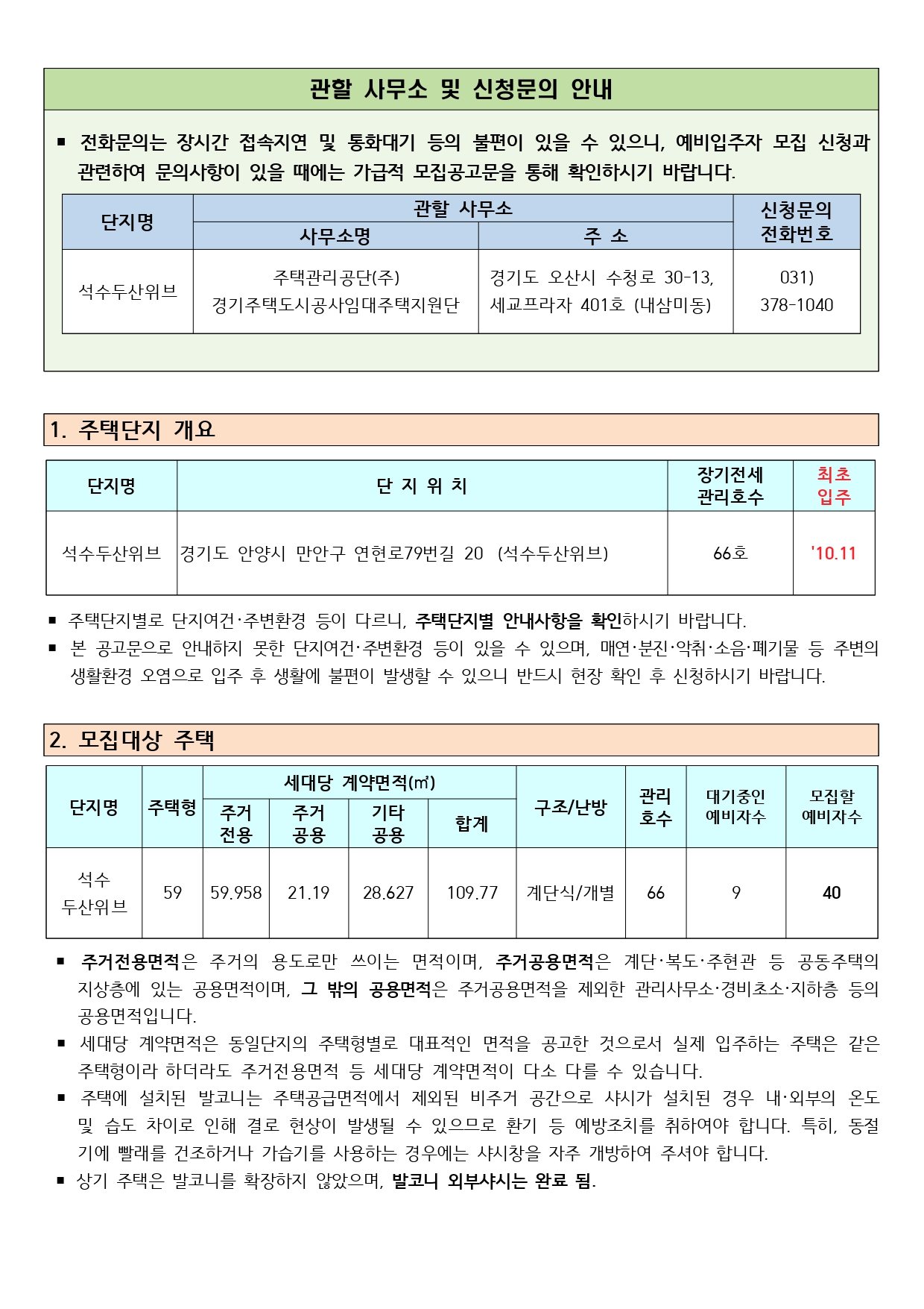 안양 석수두산위브 장기전세 예비입주자 모집공고(21.9.27)입니다.
