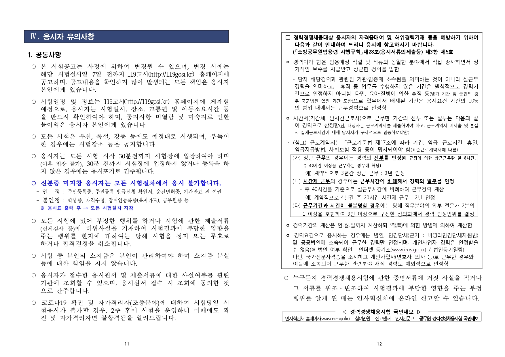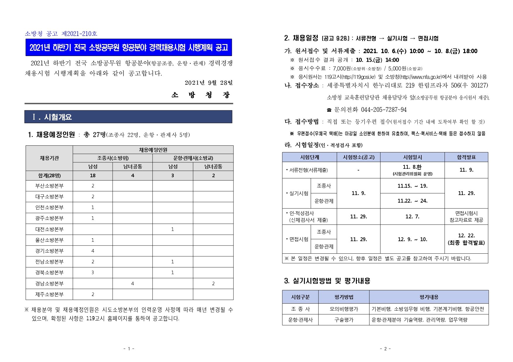 2021년 하반기 전국 소방공무원 항공분야(항공조종, 운항·관제) 경력경쟁채용시험 시행계획을 아래와 같이 공고합니다.