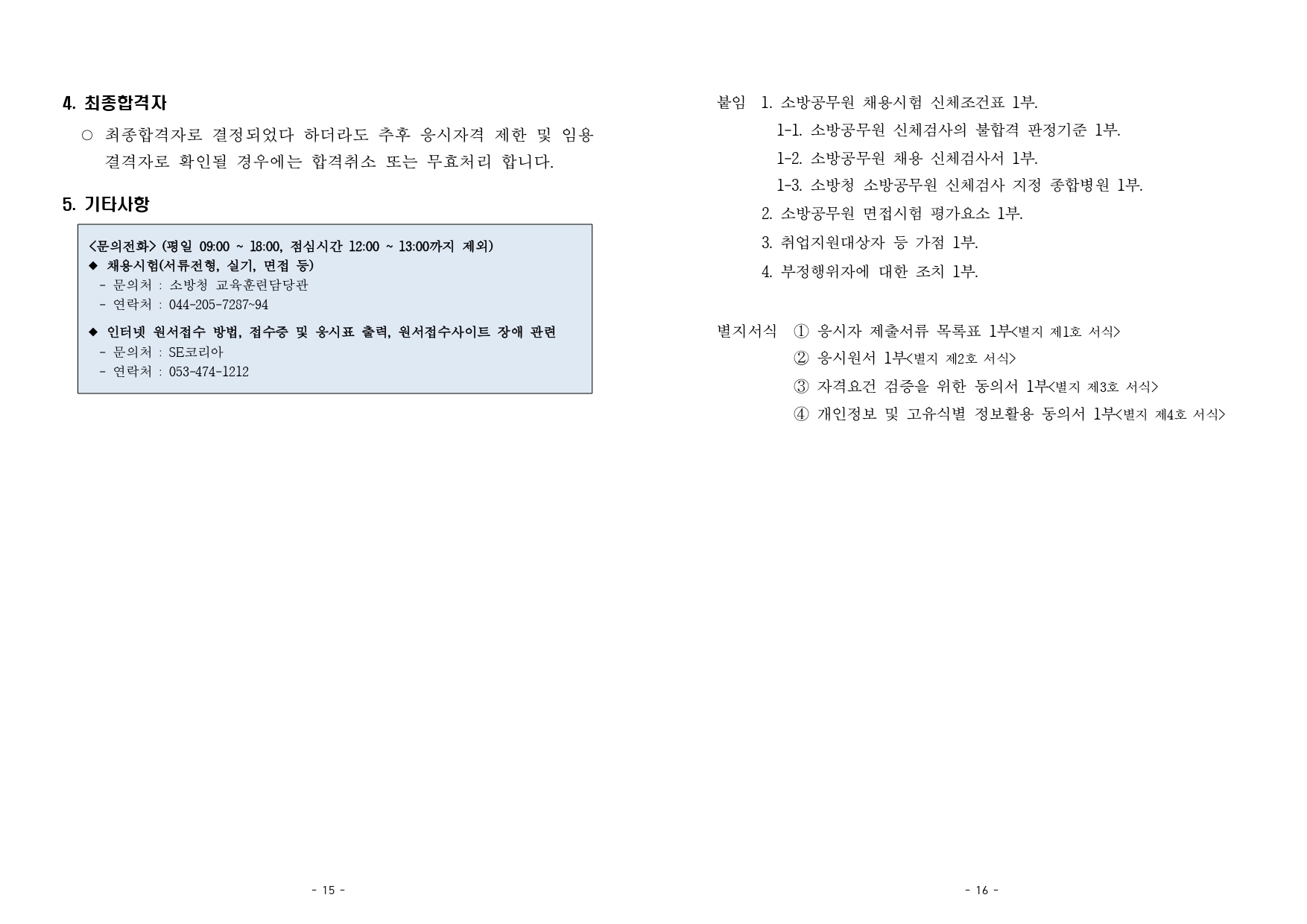소방청 교육훈련담당관 채용담당자 앞(소방공무원 항공분야 응시원서 재중), ☎ 문의전화 044-205-7287~94