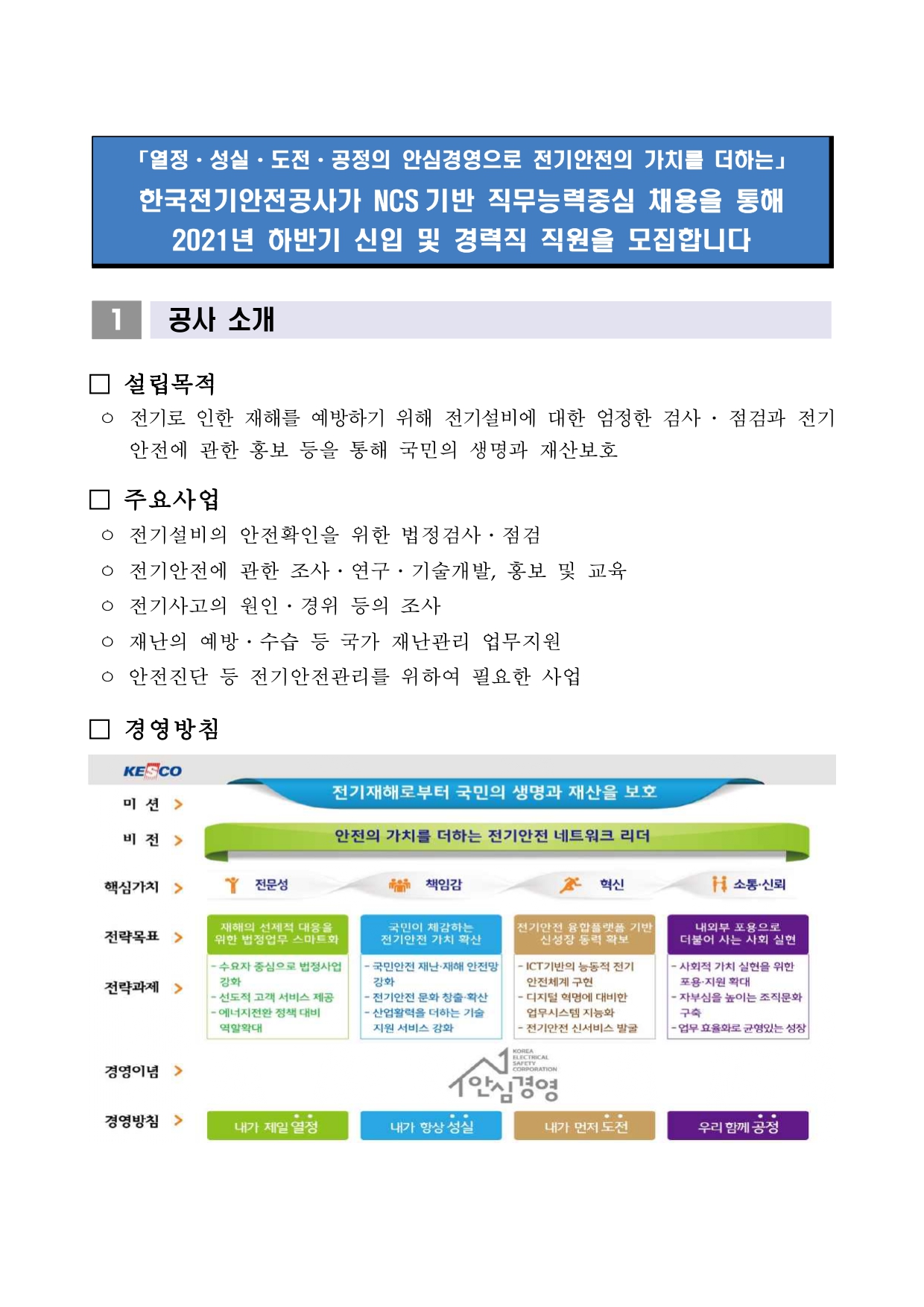 2021 하반기 한국전기안전공사 신입직원 및 경력직 공개채용 공고(~10.21)입니다.