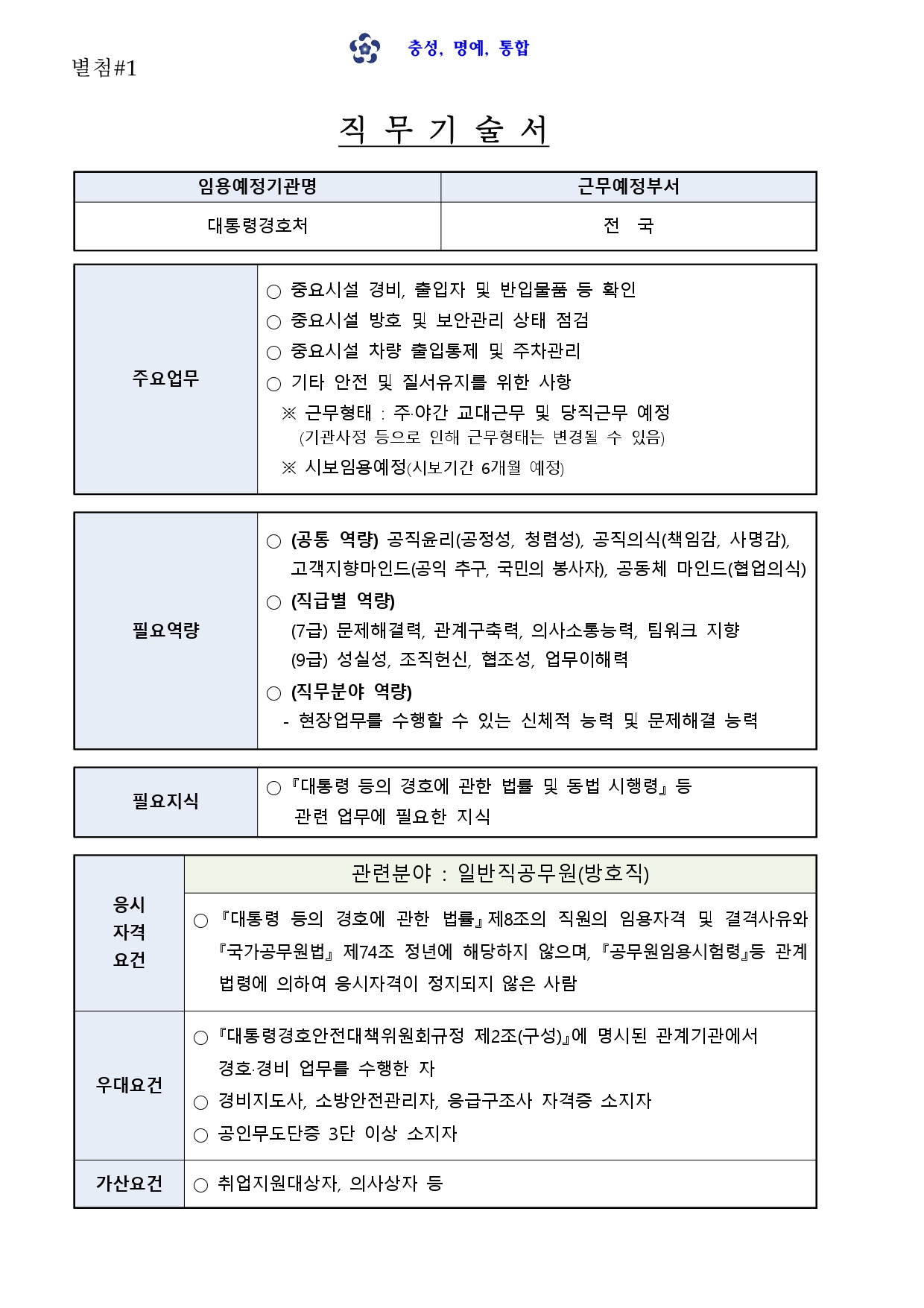 대통령경호처에서는 일반직(방호직)공무원 경력경쟁채용시험을 다음과 같이 공고하오니, 우수한 인재 여러분의 많은 응시 바랍니다.
