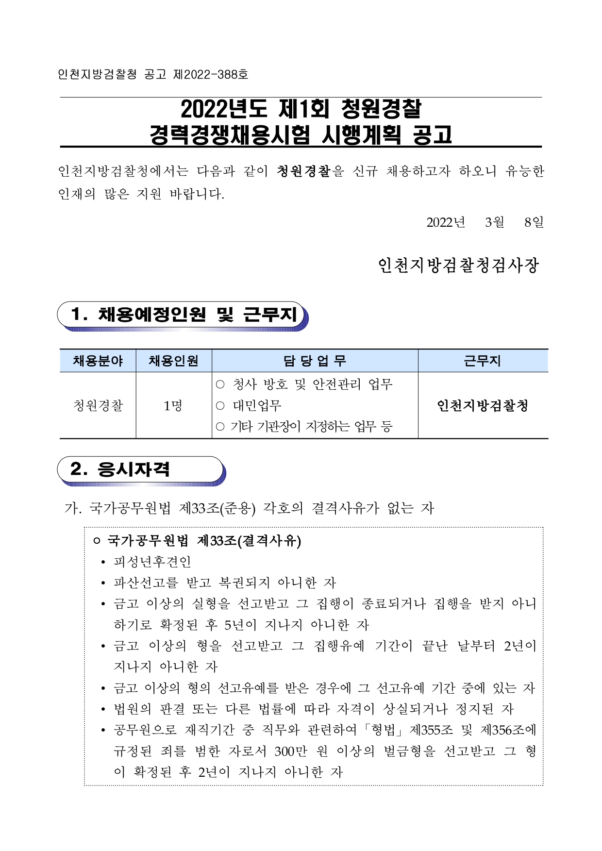 인천지방검찰청 2022년도 제1회 청원경찰 채용 공고문입니다.