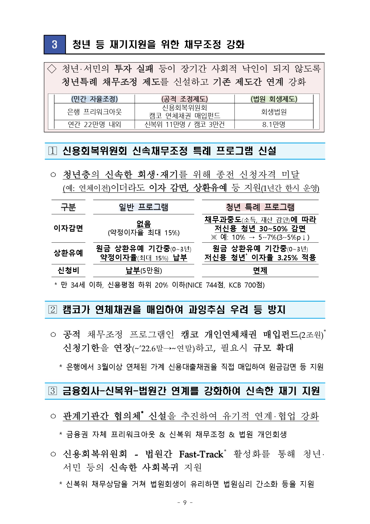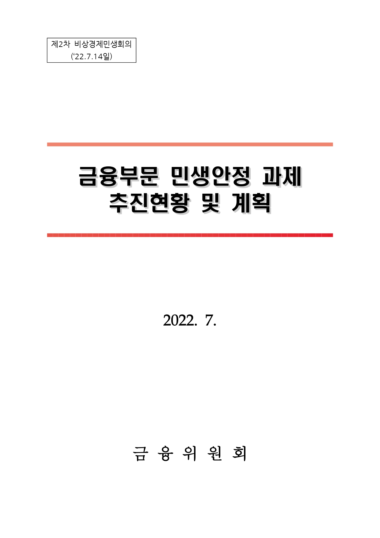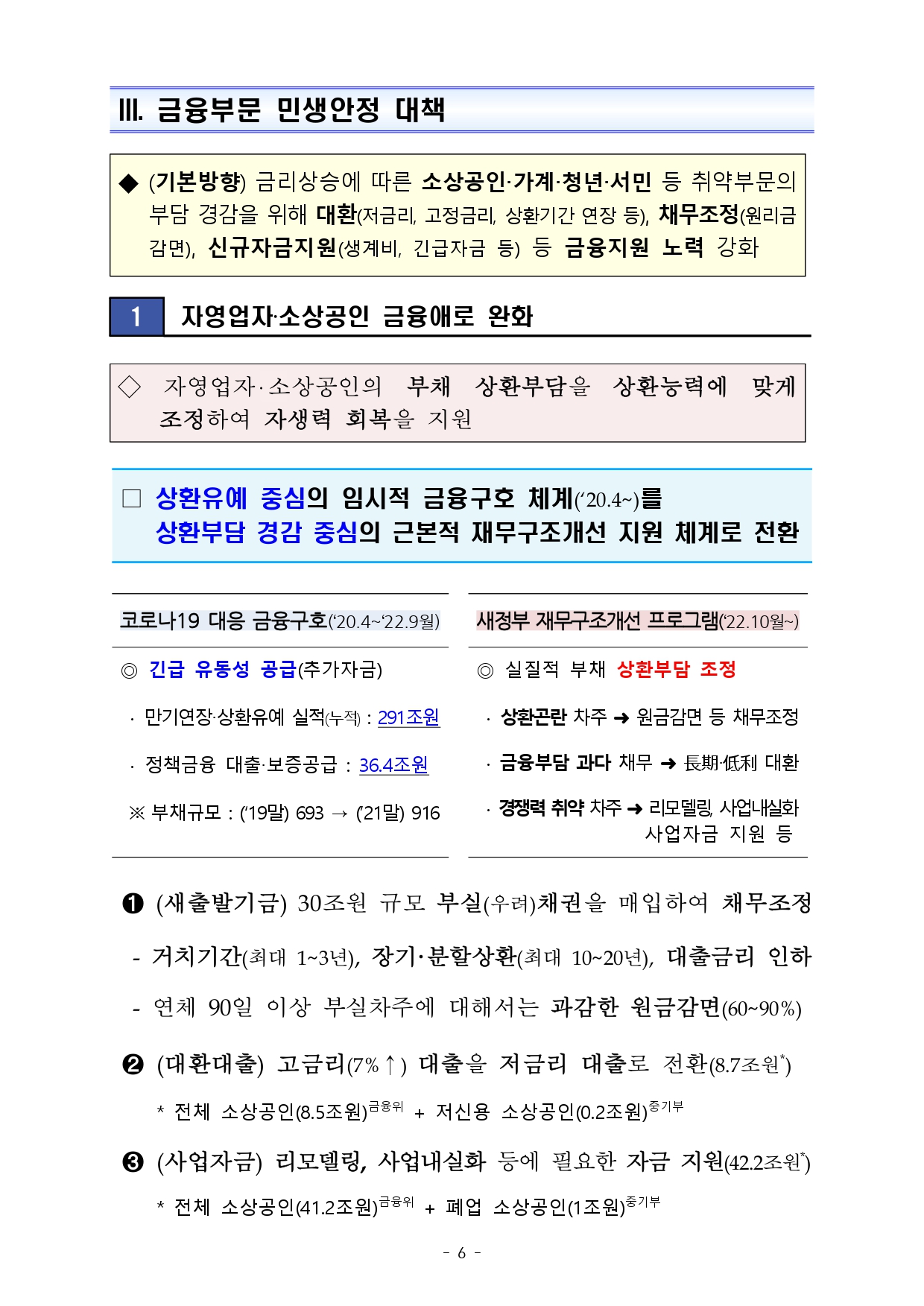 금융부문 민생안정 정책은 자영업자 및 소상공인 금융애로 완화, 주거관련 금융부담 경감, 청년 등 재기지원을 위한 채무조정 강화, 서민 저신용층 금융지원 보완 및 민생범죄 근절 등입니다.