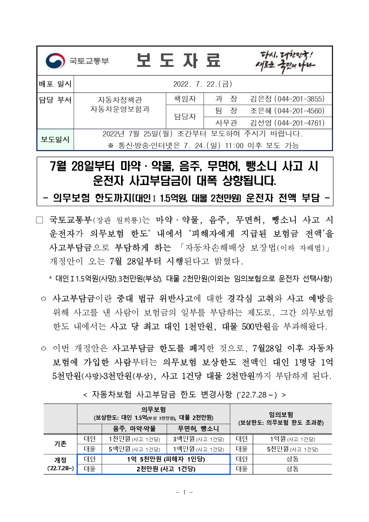 국토교통부(장관 원희룡)는 마약·약물, 음주, 무면허, 뺑소니 사고 시 운전자가 의무보험 한도* 내에서 ‘피해자에게 지급된 보험금 전액’을 사고부담금으로 부담하게 하는 「자동차손해배상 보장법(이하 자배법)」개정안을 오는 7월 28일부터 시행합니다.