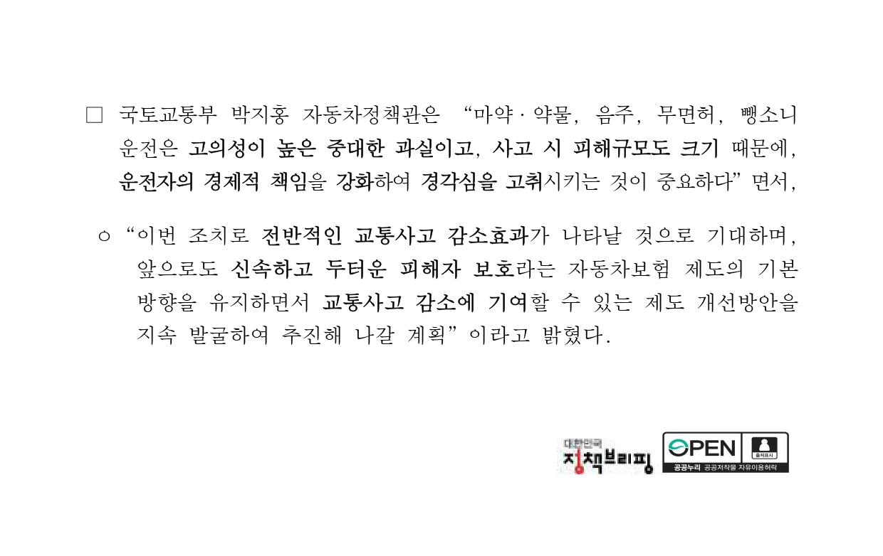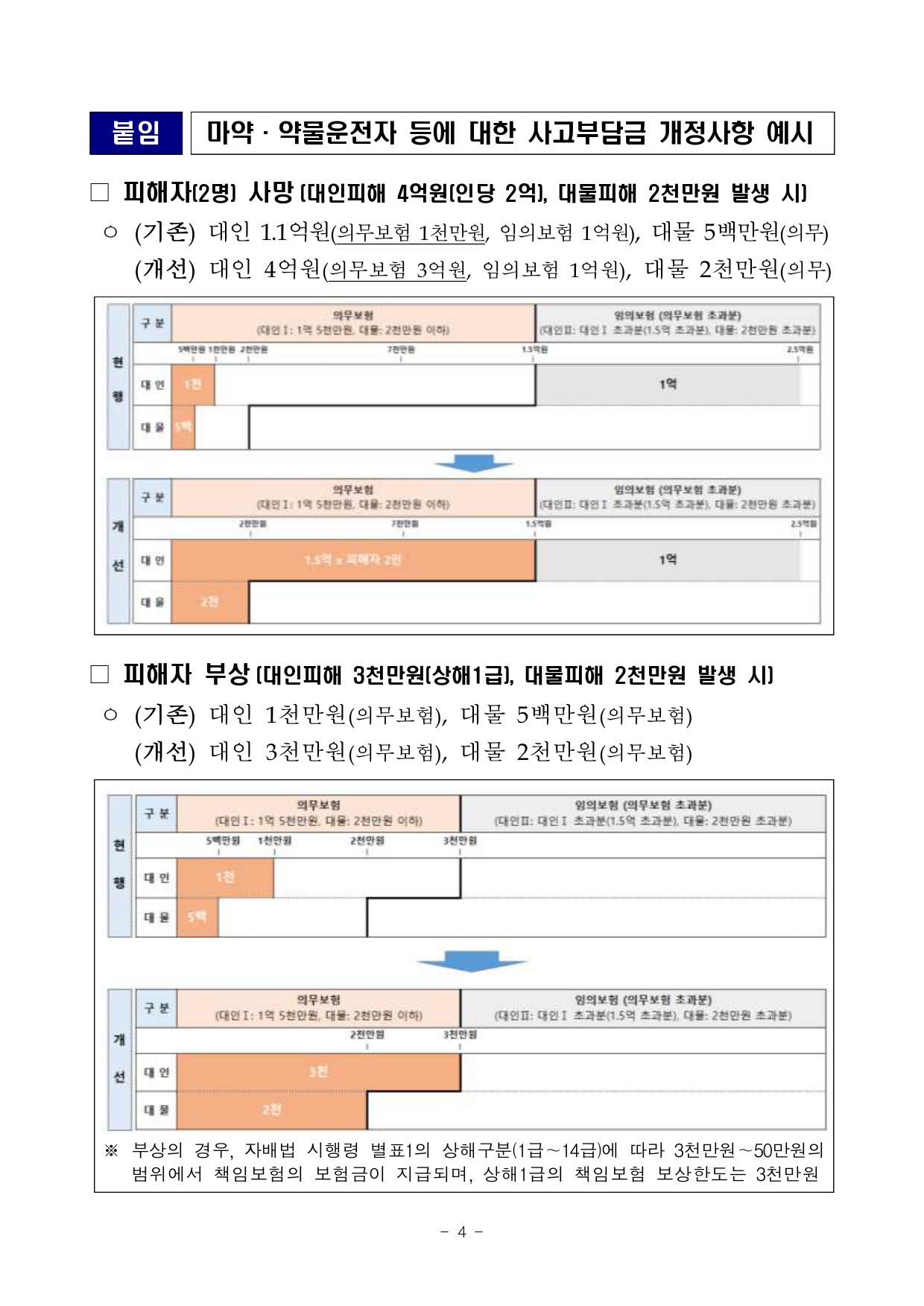 국토교통부(장관 원희룡)는 마약·약물, 음주, 무면허, 뺑소니 사고 시 운전자가 의무보험 한도* 내에서 ‘피해자에게 지급된 보험금 전액’을 사고부