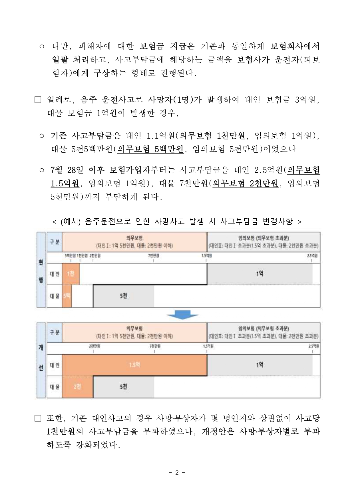 이번 개정안은 사고부담금 한도를 폐지한 것으로, 7월28일 이후 자동차 보험에 가입한 사람부터는 의무보험 보상한도 전액인 대인 1명당 1억5천만원(사망)․3천만원(부상), 사고 1건당 대물 2천만원까지 부담하게 됩니다.