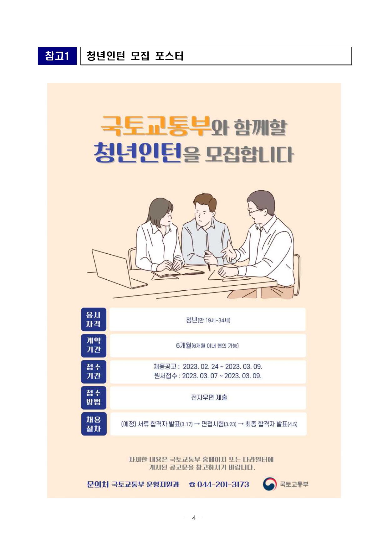 국토교통부(장관 원희룡)가 청년의 공공부문 일경험을 제공하고, 국토교통 분야 정책의 수립과 집행과정에 청년의 참여를 활성화하기 위하여 2월 24일부터 3월 9일까지 청년인턴을 모집합니다.